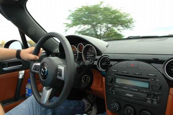 A właśnie dlatego! Nie ma nic bardziej satysfakcjonującego, niż jazda takim autem. Wsiadając czujemy się, jak czterdziestolatek, atakujący dziecięcy chodzik. A gdy już się tam jakoś znajdziemy, nasuwa się jedno określenie – szyty na miarę! Pasażer poczuje się trochę gorzej, a to z uwagi na fakt, że też chciałby kierownicę... Za to, ten co ją ma, za nic w świecie jej nie odda. Wnętrze wygląda, jakby fabryka jakimś cudem, zamontowała wszystko z modelu o trzy klasy wyższej. Jakość wykonania świetna i bez zastrzeżeń. Dotykając użytych materiałów, powoli zaczyna nam się wydawać, że to one nas głaszczą. Bez oszczędzania, bez tandety. Doskonały system audio BOSE SOUND, krótka dźwignia zmiany biegów, chroniona przez chromowaną obwódkę, nadaje się do zamiany przełożeń jak bóbr, do budowania tam. Skok jest tak mały, że niezauważalny. Całość podłączona jest do 6-biegowej skrzyni ACTIVE MATIC, dostępnej też, w opcji z „łopatkami" przy kierownicy. Setkę robimy w 7s., a pedał gazu kończy swoją drogę, w momencie, gdy pędzimy już 220km/h. Same pedały są o niebo lepiej ustawione, a fakt, że inżynierowie Mazdy na stałe włączyli mózg, świadczy zupełnie inny kąt pochylenia przednich słupków. Wreszcie widzimy co się dzieje przed nami, a jazda nie przypomina już perspektywy konia z klapkami. A jak już coś zobaczymy, w hamowaniu pomoże nam cały zestaw elektronicznych pomocników jak: ABS, ESP. W razie czego pomogą też i 4 poduszki powietrzne. Gdyby co ;) . To, że MX-5 jest mała, było wiadomo już dawno, ale, że kierownica przypomina motyw przewodni z filmu „Kochanie, zmniejszyłem dzieciaki", to już mniej. Mała, sprytna, ładna, dobra i trójramienna. Cmok! Ważne jest, że nie tylko kierownica, ale cały układ kierowniczy jest bardzo czuły i precyzyjny. A na koniec, jak się wychylimy, przeciągniemy i przypadkiem zahaczymy ręką za świetnie trzymające kremowe fotele, okaże się, że wcale nie musieliśmy zjadać tej połówki batonika. Swobodnie trzeba było go, po prostu przełamać...