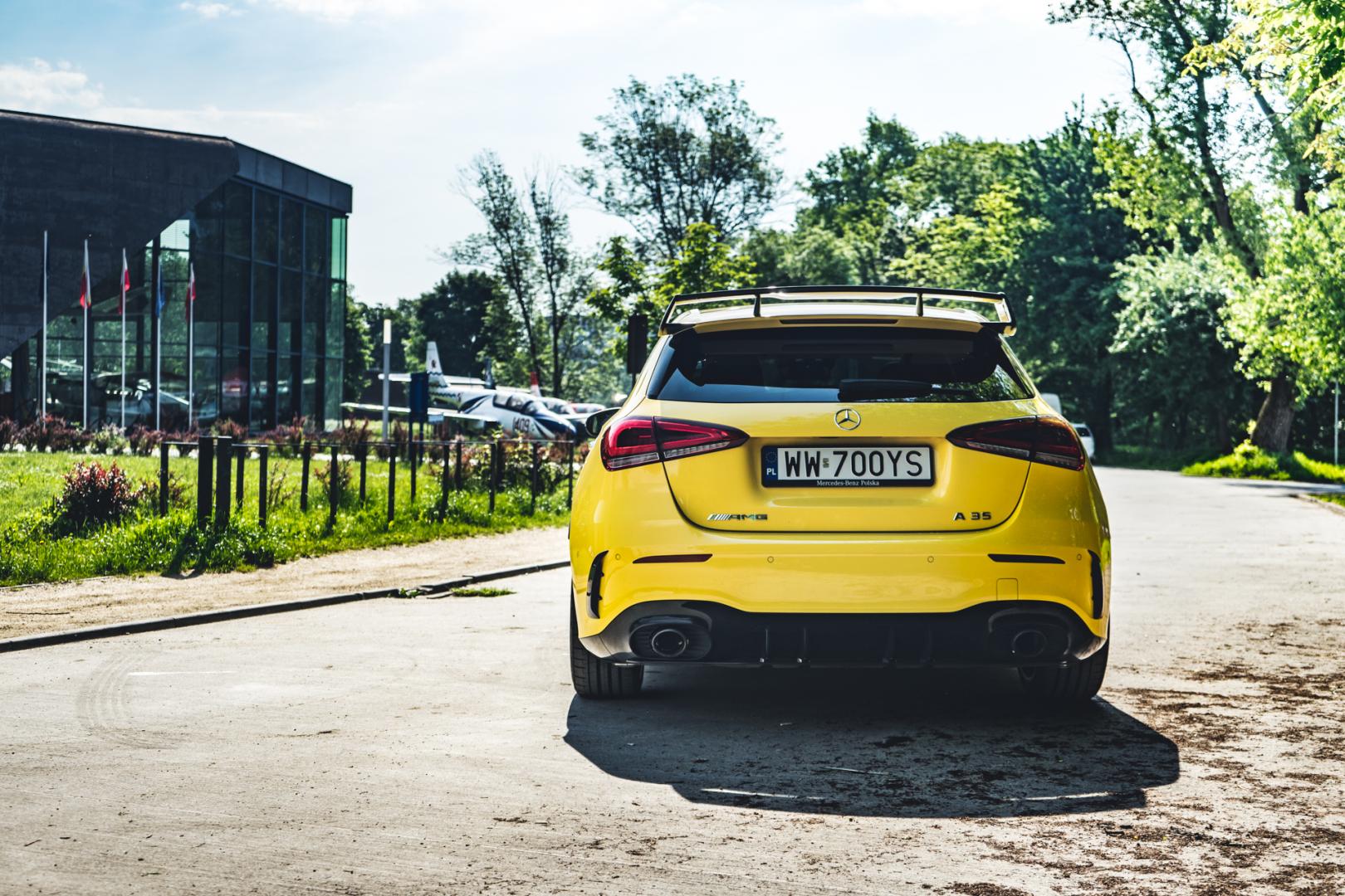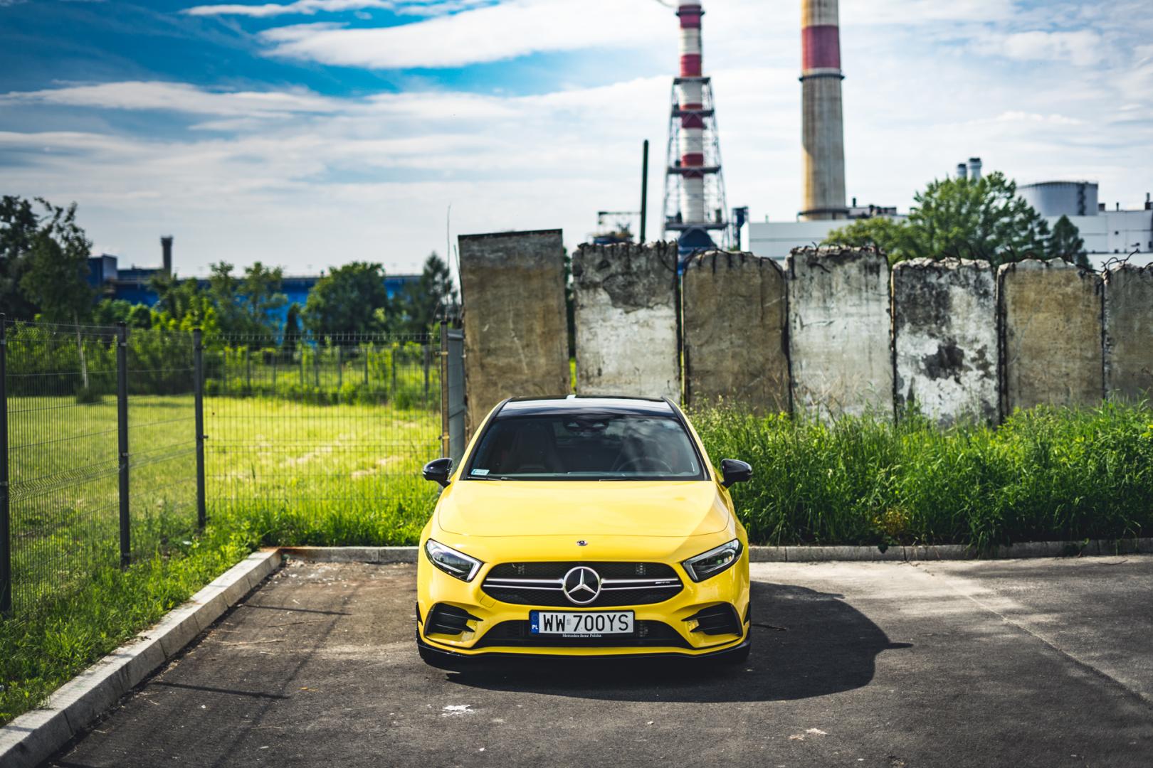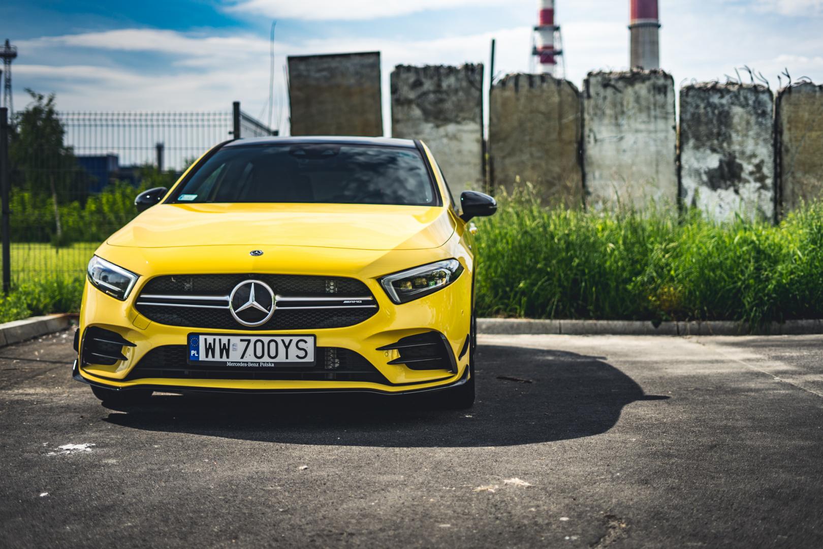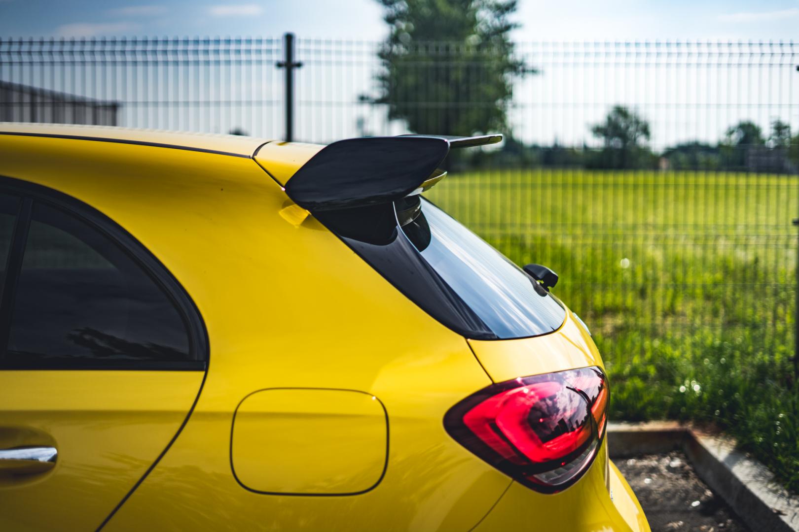 Agresywna stylistyka A35 dobrze pasuje do dynamicznych linii nowej Klasy A. Żółty, wyrazisty kolor jeszcze dodatkowo to podkreśla i świetnie komponuje się z czarnymi 21-calowymi kołami.