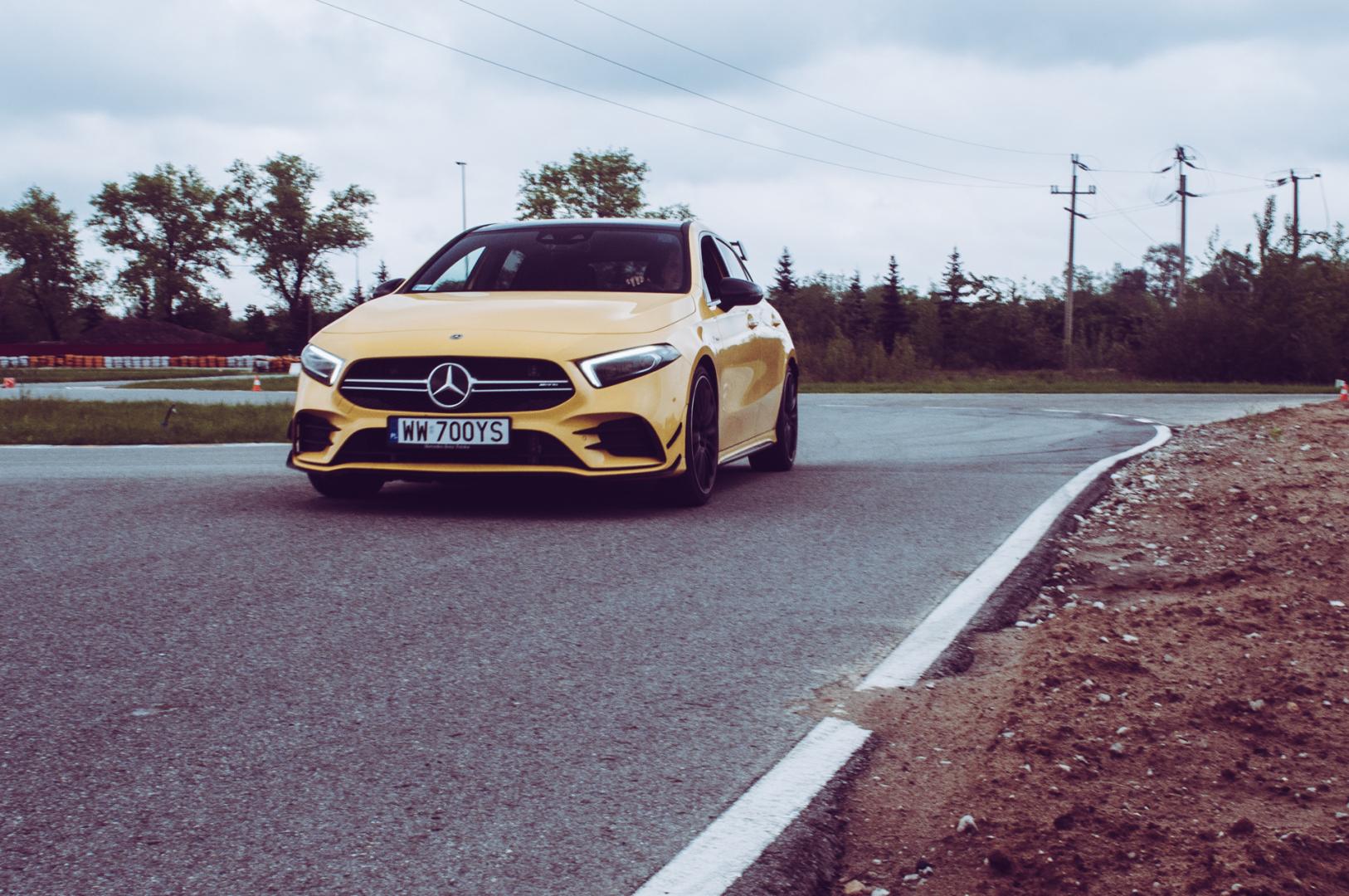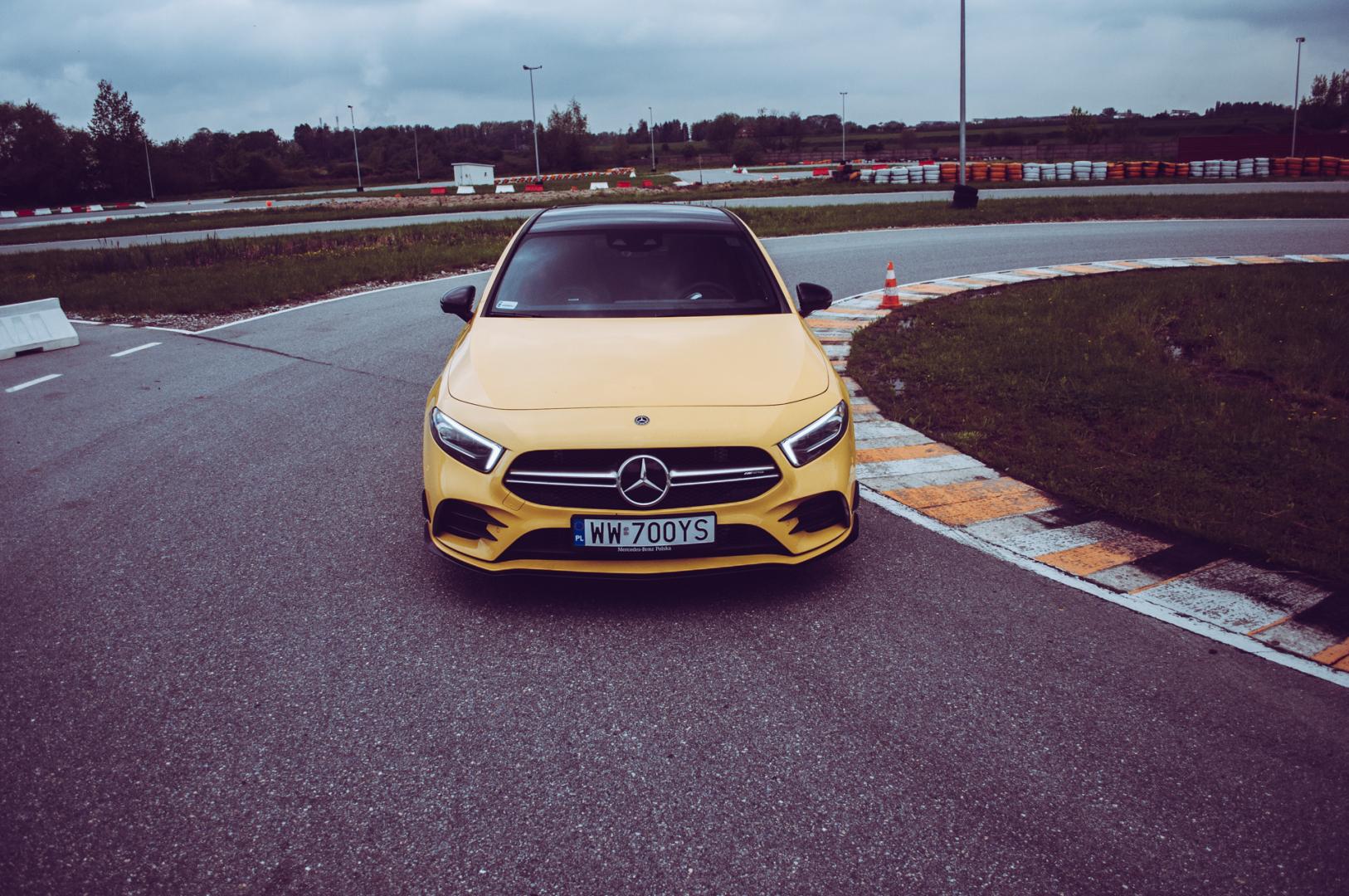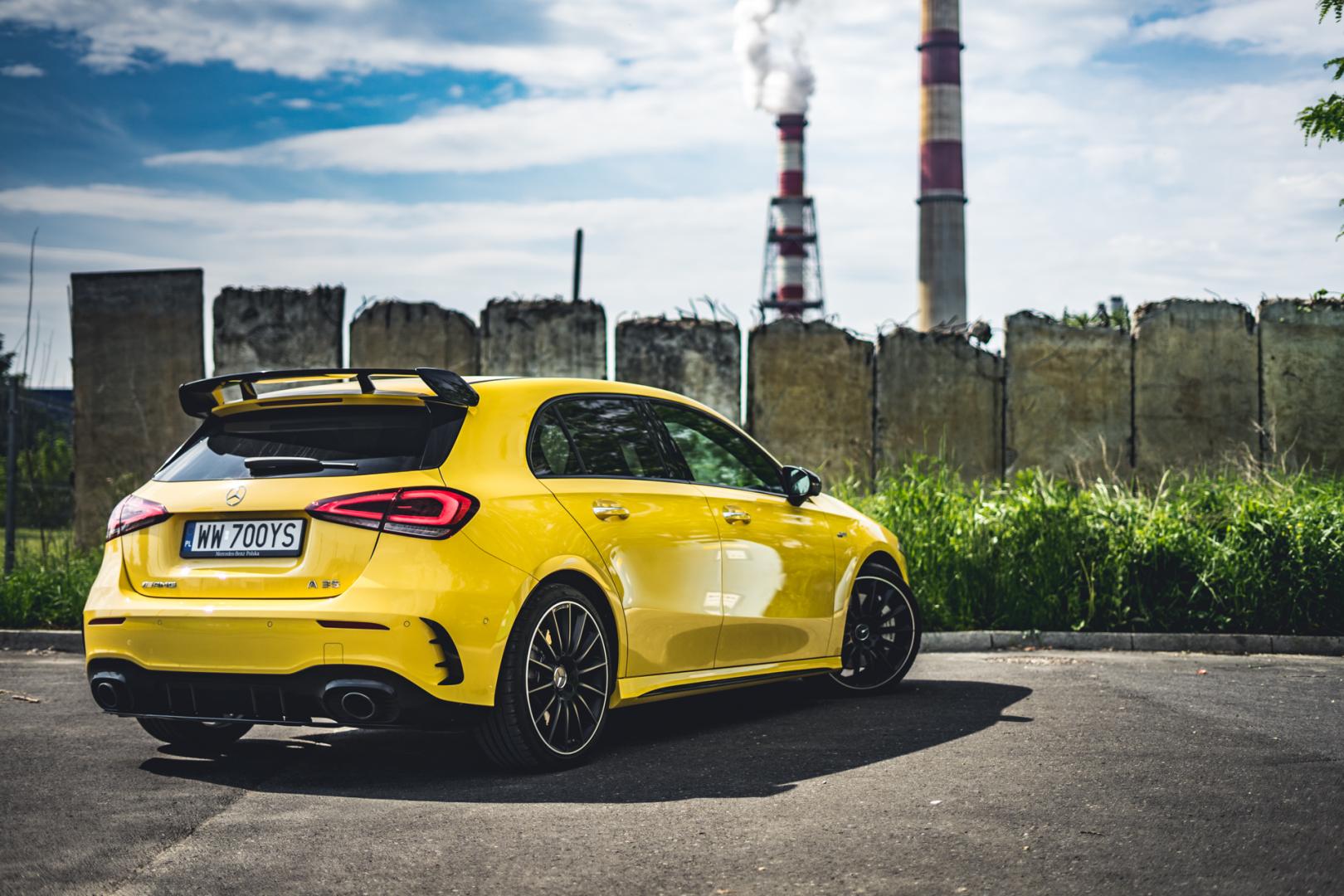 Agresywna stylistyka A35 dobrze pasuje do dynamicznych linii nowej Klasy A. Żółty, wyrazisty kolor jeszcze dodatkowo to podkreśla i świetnie komponuje się z czarnymi 21-calowymi kołami.