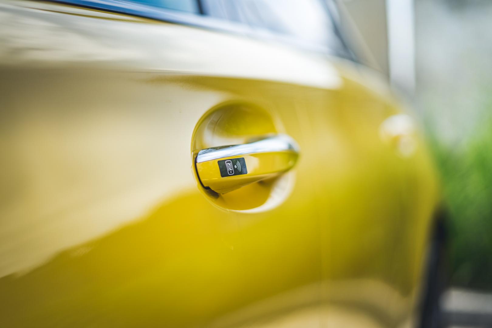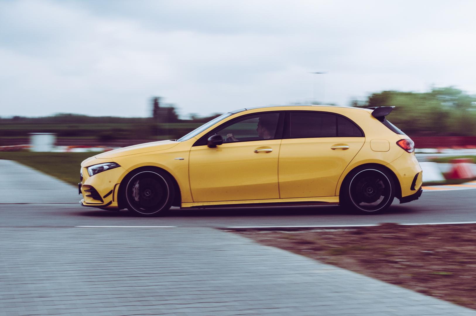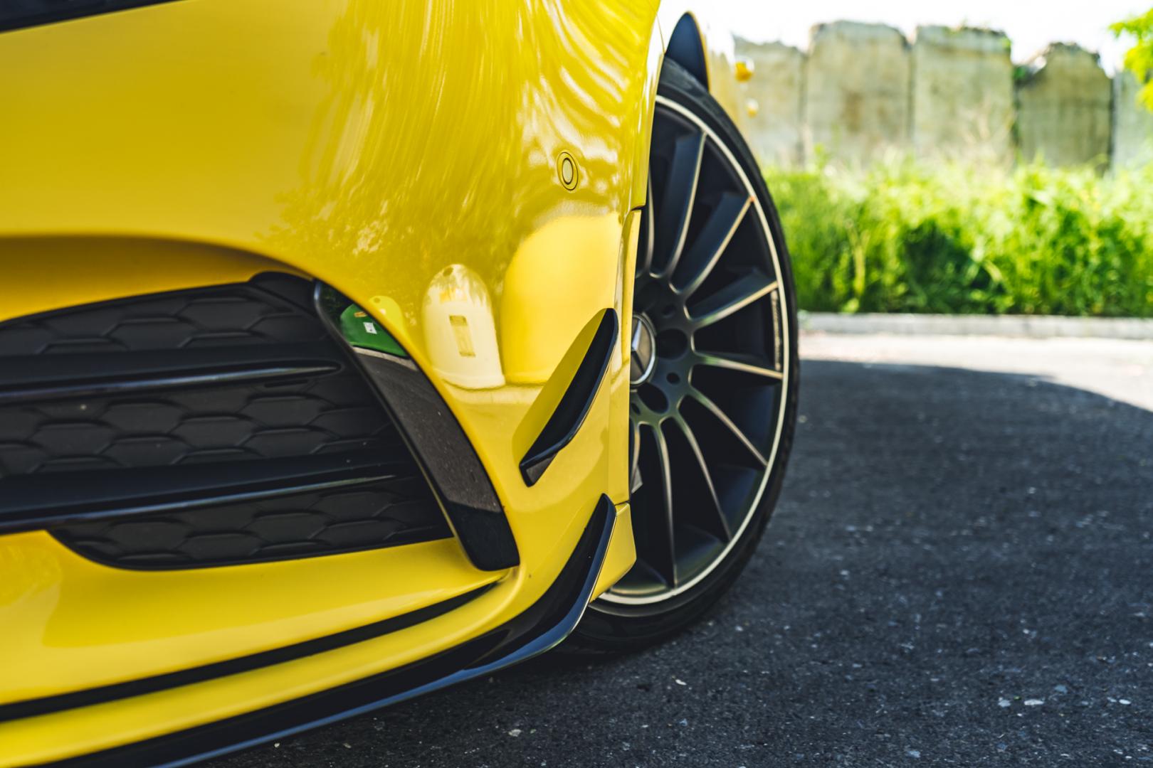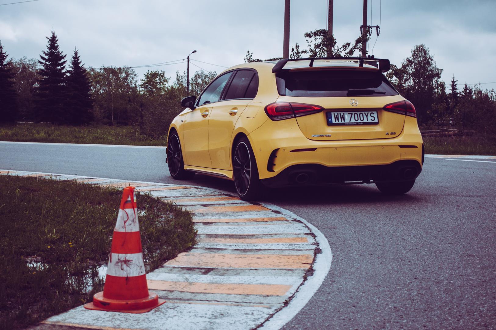 Agresywna stylistyka A35 dobrze pasuje do dynamicznych linii nowej Klasy A. Żółty, wyrazisty kolor jeszcze dodatkowo to podkreśla i świetnie komponuje się z czarnymi 21-calowymi kołami.