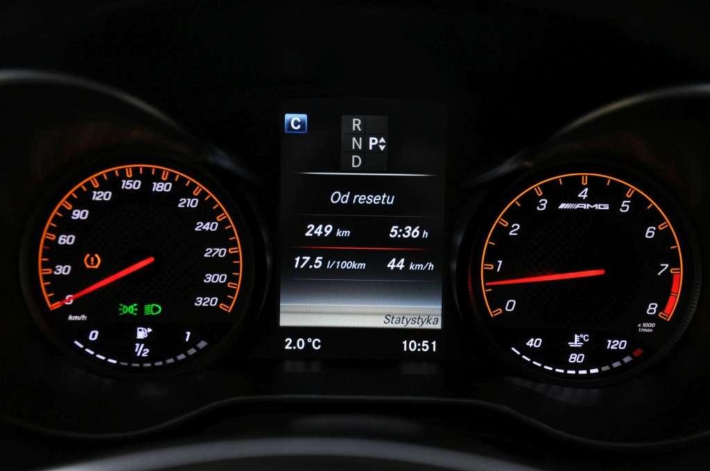 Dla porządku dodajmy, że to nie jest najmocniejsza odmiana, brakuje tu oznaczenia S, dodawanego do nazwy widniejącej na tylnej klapie. Topowa wersja ma 510 KM i 700 Nm momentu, ale pozwala to skrócić czas rozpędzania się do setki o zaledwie 0,1 sekundy, a prędkość maksymalna, czy fabryczna (250 km/h), czy też odblokowana (290 km/h) jest identyczna dla obu wersji. Tak samo jak spalanie. S-ka ma jeszcze większe 19-calowe koła, elektroniczne sterowanie szperą i aktywne poduszki silnika. Za dodatkowe 34 KM wersji C63 S Mercedes żąda dopłaty ponad 40 tys. zł.