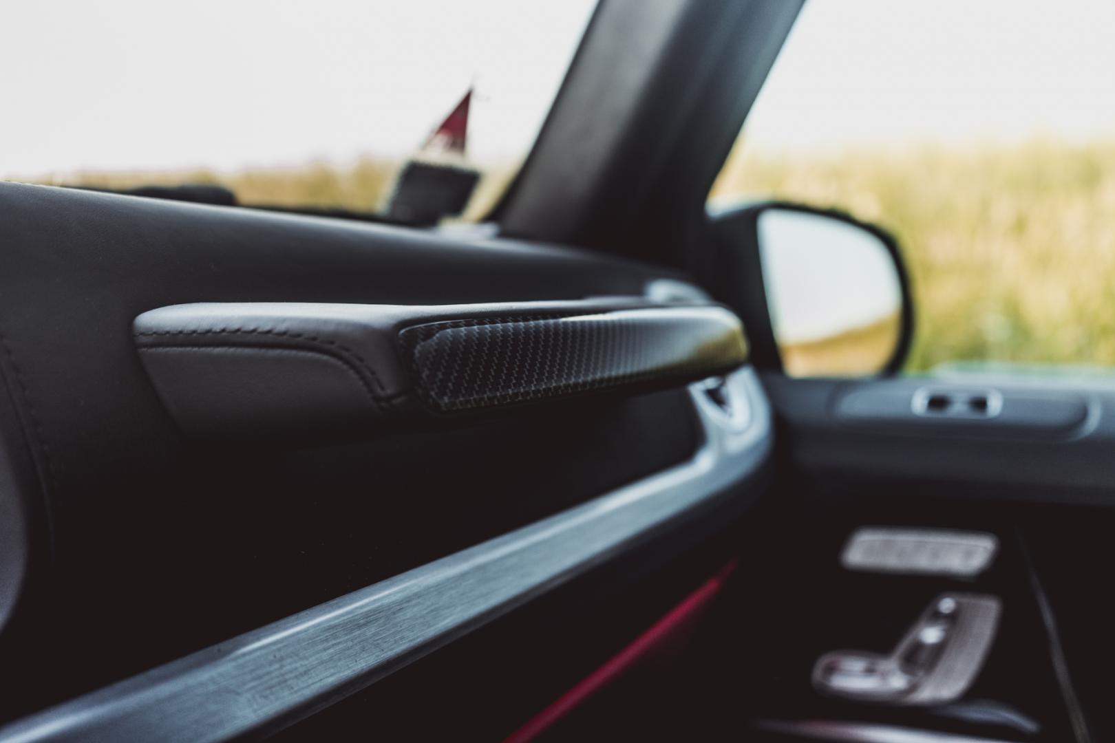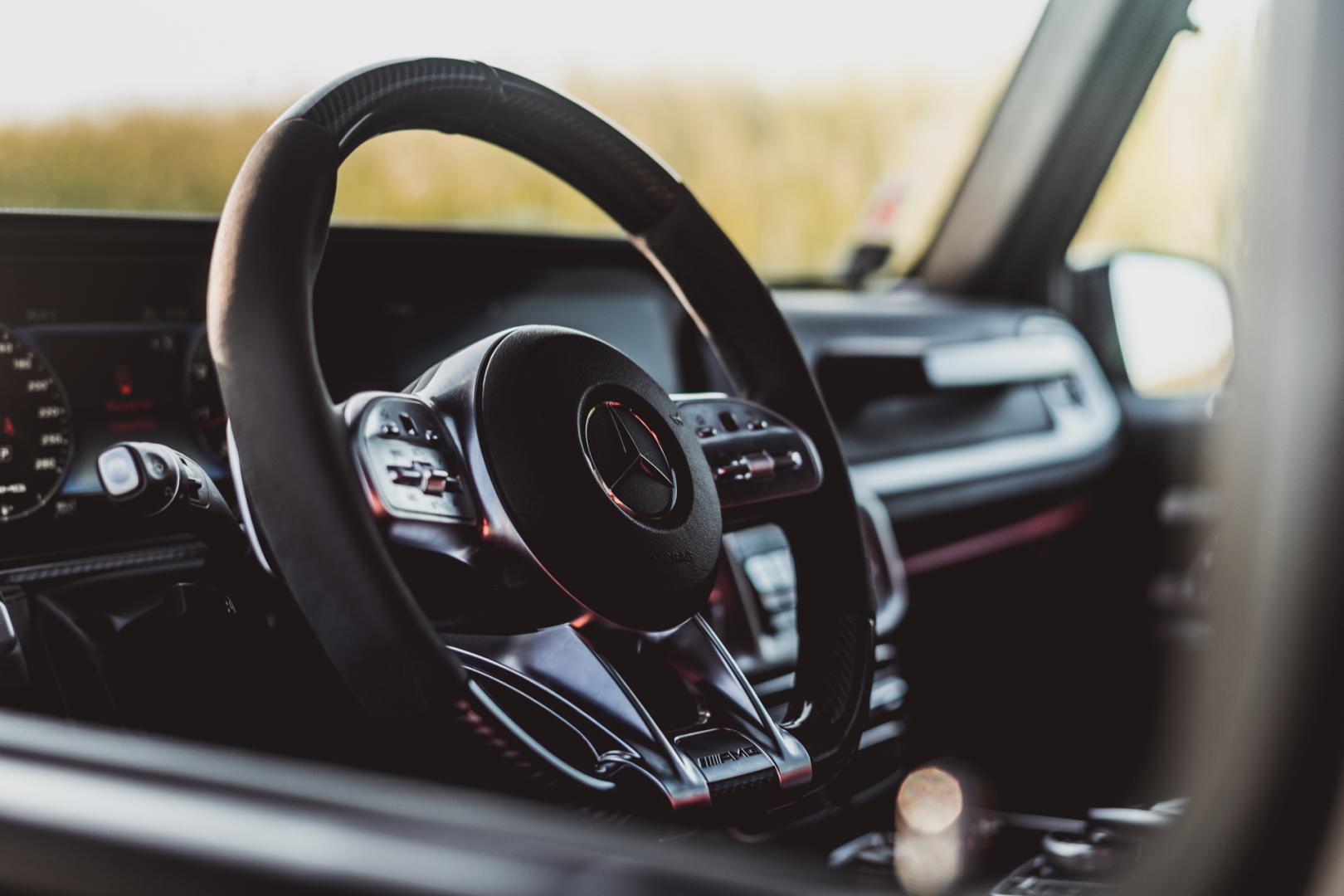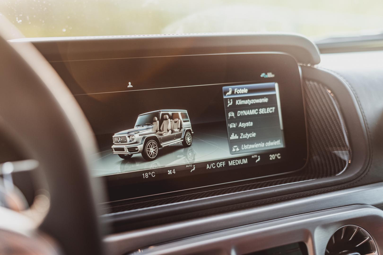 Pozycja za kierownicą jest wysoka, ale fotele Mercedesa-AMG G63 dobrze trzymają w zakrętach. Łatwo znajdziemy wygodną pozycję. Jeśli jesteście fanami jazdy z „zimnym łokciem”, to Klasa G nadaje się do tego idealnie, bo dolna krawędź okna jest poprowadzona bardzo nisko. To bardzo praktyczne, bo dzięki temu mamy też świetną widoczność.