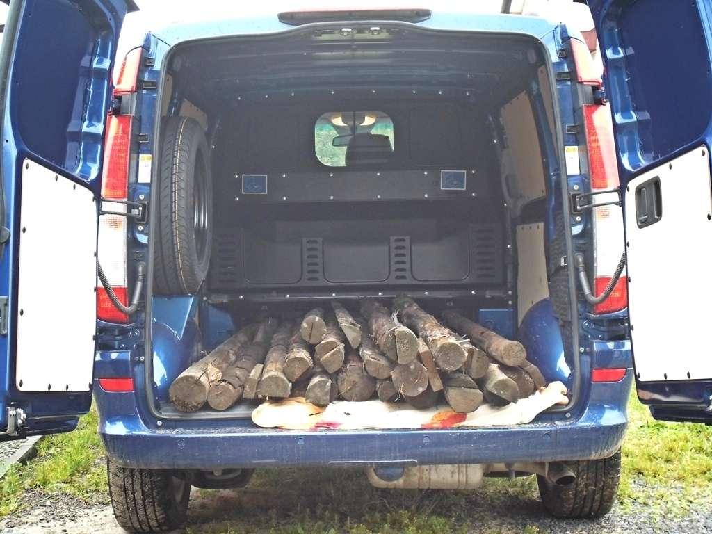 Czas przyjrzeć się przestrzeni ładunkowej Mercedesa Vito. Do testu otrzymaliśmy wersję Furgon z najkrótszym rozstawem osi. Nie oznacza to, że nie można tu niczego wpakować. Mercedes mieści 5,2 m³ pakunków - sporo. Na pewno zmieszczą się tu dwie europalety, ale nie miałem możliwości tego sprawdzić. Zrobiłem za to inny test. Pod domem od dawna walały się stemple budowlane, których chciałem się pozbyć. Może zatem to dobry moment? Doskonały. Drewniane stemple miały długość od 2 do 2,5-metra. 20 sztuk ledwie pokryło podłogę, a jedynym mankamentem był brak możliwości domknięcia drzwi. Wersja z najmniejszym rozstawem osi mieści w sobie bez problemu 2,4-metrowe ładunki. Drzwi udało się umocować z pomocą linek i tak zabezpieczony ładunek z łatwością przewieźć.
