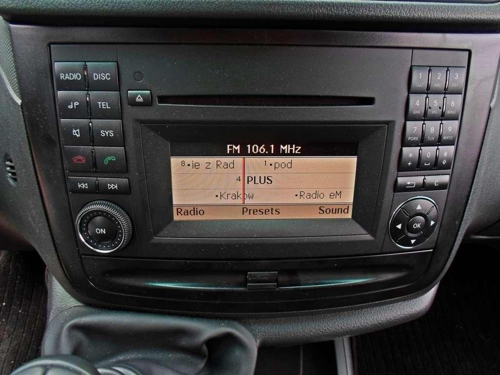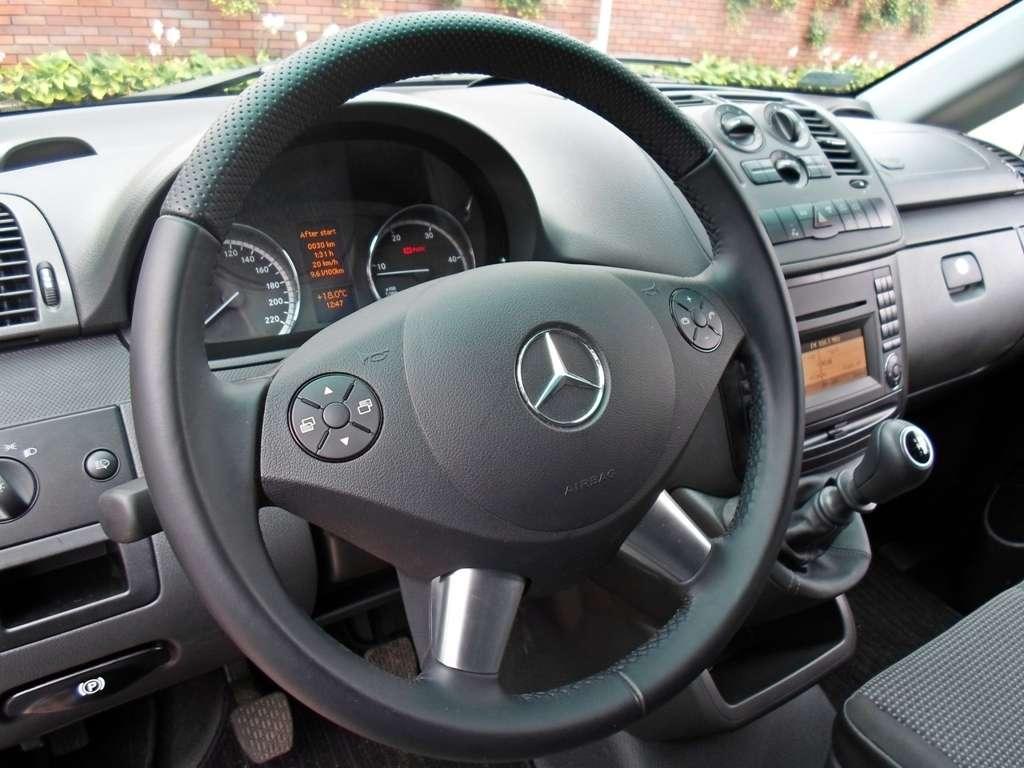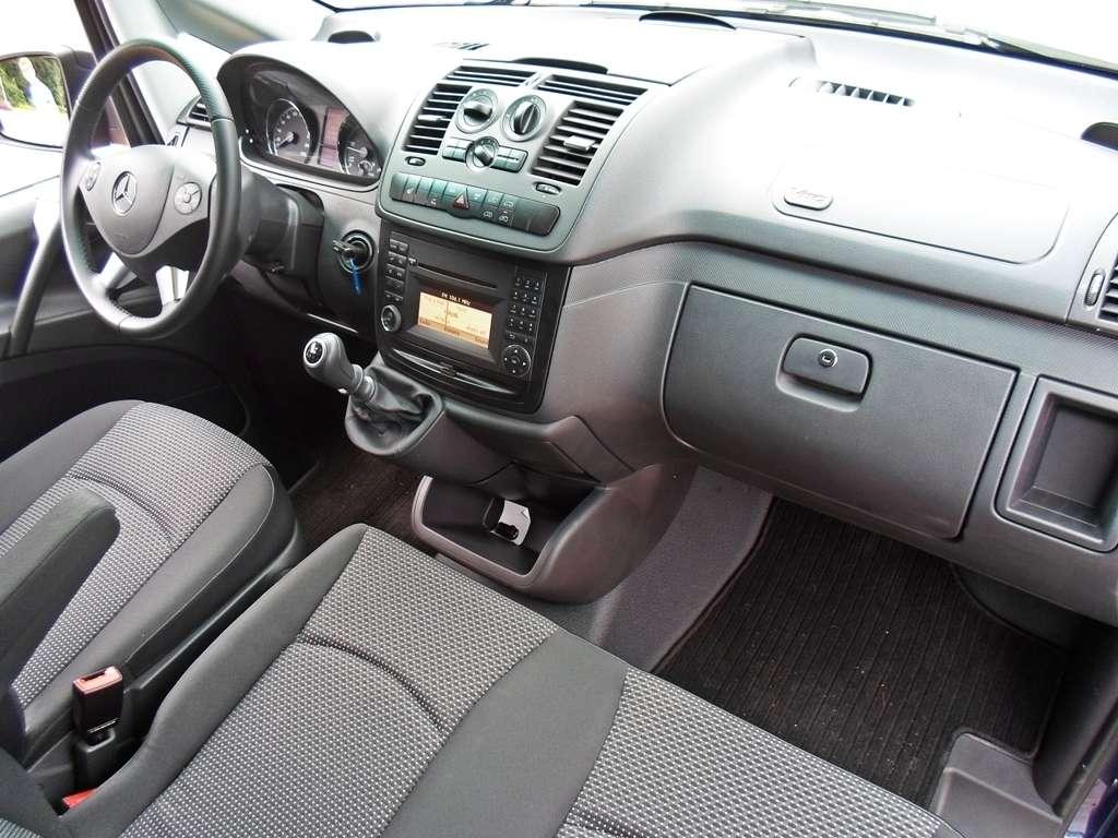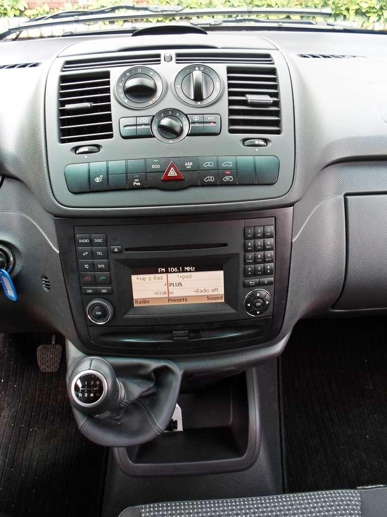 A propos rozmiaru tego samochodu - nie należy on do małych, ale urzekł mnie swoją zwrotnością. Przy długości 4,8-metra oraz szerokości zbliżającej się do 200 centymetrów Vito chwali się średnicą zawracania na poziomie 11,5 metra, co w połączeniu z opcjonalnym pakietem Parktronic działającym na zasadzie echolokacji, pozwala na bezstresową jazdę nawet po zatłoczonych ulicach. Wskaźniki czujników parkowania znajdują się w trzech punktach deski rozdzielczej - po obu bokach i na środku, co daje nam dokładną informację, gdzie znajduje się widziana przez nie przeszkoda.