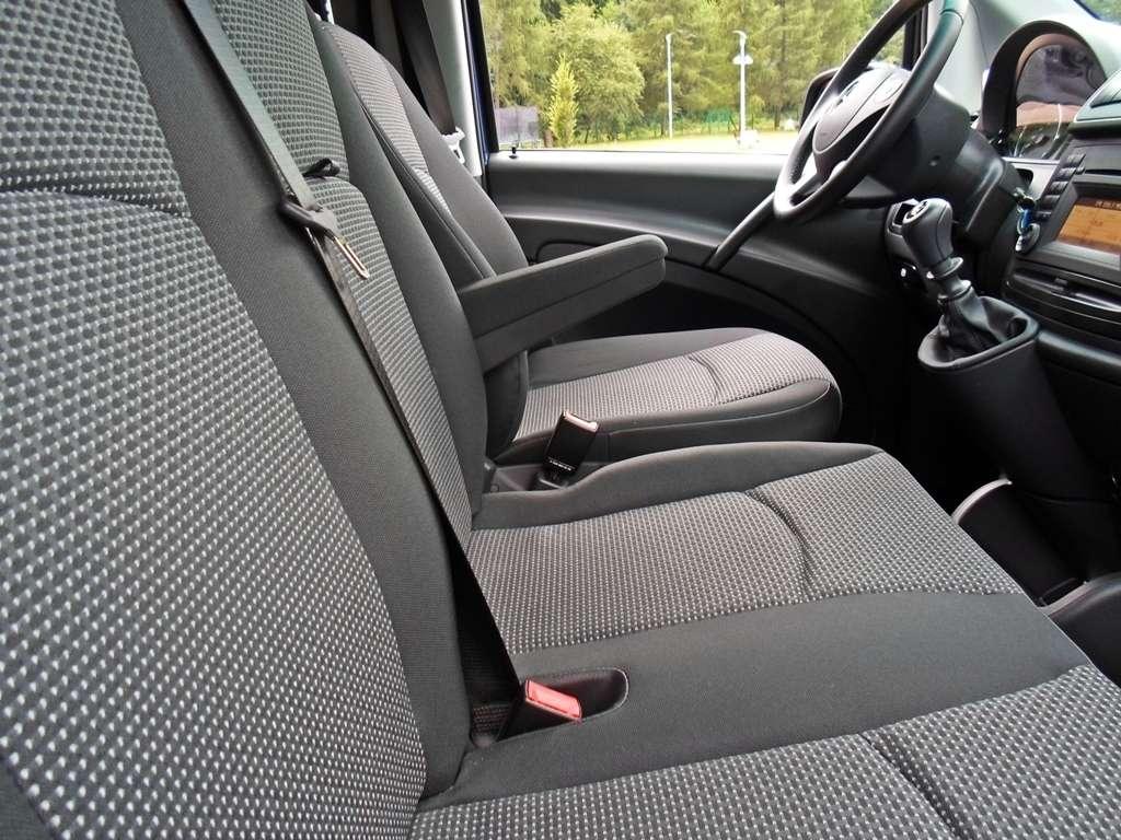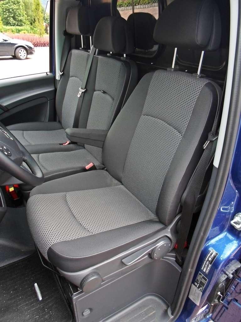 Czas na zajęcie miejsca za kierownicą. Ta czynność przypomina wskakiwanie, mimo że nie należę do osób o skromnym wzroście przyznam się, że używałem czasami schodka, który ukryto między drzwiami i fotelem. Niższym kierowcom będzie nieodzowny. Kiedy już dostałem się na fotel wydawało mi się, że znajduje się 2 metry nad ziemią. To efekt przesiadki z samochodu osobowego, ale niewątpliwie z Vito patrzy się na drogę z dużej wysokości. Coś mi jednak nie grało. Rozpocząłem regulację fotela, jednak szybko okazało się, że niewiele da się tu zrobić. Przegroda między kabiną pasażerską, a przestrzenią ładunkową skutecznie ogranicza możliwość odsunięcia fotela w tył. Regulacja wysokości fotela umożliwia siedzenie tylko wysoko lub...bardzo wysoko. Obniżyłem fotel maksymalnie i przy wzroście ponad 190 centymetrów miałem już praktycznie głowę pod sufitem i krawędzie dachu ograniczały mi widoczność podczas postoju pod sygnalizacją świetlną. Nie brakuje miejsca na szerokość, fotel kierowcy ma regulację siedziska pod kolanami, a widoczność do przodu i przez lusterka boczne nie pozostawia wiele do życzenia. Z przodu wygospodarowano miejsca dla trzech osób. Tak mówi teoria, bo praktyka pokazuje, że na środku usiądzie tylko ktoś bez nóg lub dziecko. Przestrzeni na nogi dla środkowego pasażera najzwyczajniej nie ma, bo zajmuje je konsola środkowa. Oczywiście awaryjnie sąsiad po prawej pożyczy miejsca, ale o długiej trasie w takich warunkach można pomarzyć.