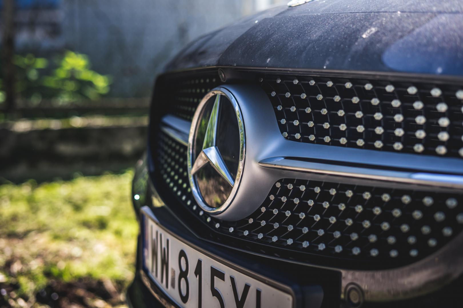 Testowaliśmy wersję z opcjonalnym pakietem AMG za 12 tysięcy złotych. Za jednym kliknięciem w konfiguratorze kryją się reflektory LED, sportowe zawieszenie, 18-calowe koła, grill o fakturze przypominającej diamenty i moim zdaniem ładniejsze zderzaki z dużymi wlotami.