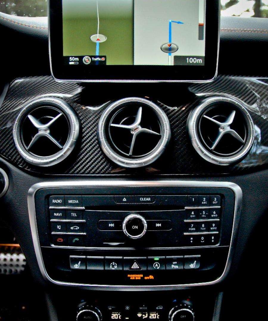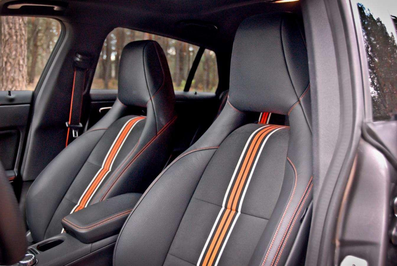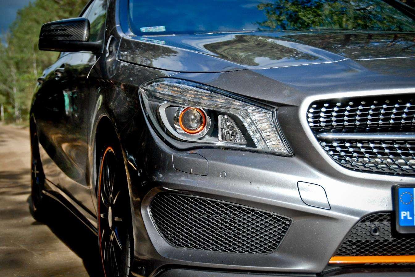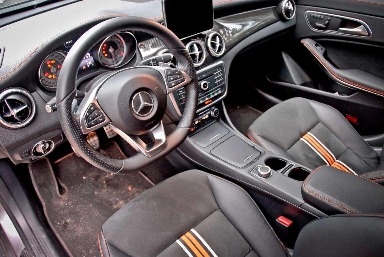 Testowy egzemplarz wzbogacono o pakiet stylistyczny OrangeArt. Nawiązuje on do limitowanej serii OrangeArt Edition - najmocniejszych modeli CLA 45 AMG. Wprawne oko zauważy, że są to tylko nawiązania, gdyż pakiet dostosowano do wersji wielkoseryjnych korzystających m.in. z inaczej wyglądających zderzaków. Pomarańczowe paski pojawiają się więc na zderzakach, czarnych kołach, a także we wnętrzu, gdzie standardowa tapicerka ustąpiła miejsca stylizowanym na sportowo fotelom pokrytym skórą i alkantarą ze zintegrowanymi zagłówkami. Paski na siedzeniach to nie wszystko, pojawiają sie też na pasach bezpieczeństwa, a szwy wykonano pomarańczowa nicią. Specjalista od modeli CLA 45 AMG doda zaraz, ?e w topowych wersjach fotele są inne, a ilość pomarańczowych wstawek jest bogatsza, ale w tym przypadku nie o to chodzi. Auto ma zwracać na siebie uwagę, dawać kierowcy namiastkę obcowania z „czterdzieską piątką”. Ale bez konieczności męczenia się na co dzień z zachłannym na paliwo i mocno utwardzonym podwoziem.