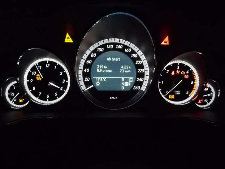 Wszystko w Mercedesie jest rozmieszczone i poukładane wg nieprzypadkowego schematu. To jeden z powodów, dla którego niektórzy kierowcy pozostają wierni tej marce od lat. Gdy spoglądamy na tablicę zegarów, od razu widzimy prędkościomierz ze zintegrowanym w środku wyświetlaczem komputera pokładowego. Po bokach mamy, nieco mniejsze, zegar i obrotomierz. Zamiast srebrnego tła, które mnie nie zachwyciło, w innych wersjach występuje także czarne. Czasem nieco nadużywamy pokreślenia „komputer pokładowy". Tutaj jest ono jak najbardziej na miejscu, bowiem oprócz standardowych informacji, jak zasięg, średnie zużycie paliwa możemy zobaczyć np. filiżankę kawy na spodeczku. Komputer analizuje różne parametry jazdy i na tej podstawie „wie", kiedy kierowca powinien odpocząć i sygnalizuje to w przedstawiony powyżej sposób (nazwano to Attention Assist). Mnie akurat nigdy nie zaproponował pauzy, więc nie zdołałem tego uwiecznić na zdjęciu. W opcji jest również system Distronic Plus zapobiegający najechaniu na pojazd jadący przed nami i pozwalający utrzymać stałą odległość za nim. Jego informacje również pojawiają się na tymże wyświetlaczu. Można oczywiście także, po przełączeniu, śledzić komunikaty RDS wybranej stacji radiowej itp. W Mercedesie nie istnieje właściwie tzw. licznik dzienny, ponieważ każdego dnia rano automatycznie jest zapisywany czas jazdy, przebyty dystans, średnie zużycie paliwa i średnia prędkość. Oprócz tego mamy opcję „od zerowania" dającą możliwość odczytu powyższych informacji z kilkudniowej trasy lub np. dłuższego wyjazdu urlopowego. To pozwala m.in. na bieżąco kontrolować nasz sposób jazdy i analizować zużycie paliwa. Choć oczywiście niektórzy powiedzą, że kupując taki wóz, średnie zużycie paliwa schodzi na plan dalszy i litr w jedną lub drugą stronę nie ma znaczenia….