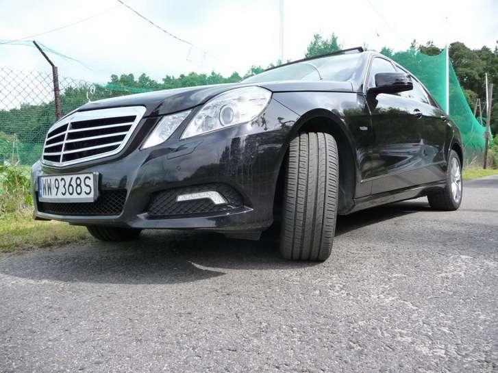 O przytulnym wnętrzu E – Klasy można by pisać jeszcze długo, ale czas ruszyć z miejsca. I to też jeszcze nie jest takie proste, bo można wybrać opcję regulacji zawieszenia „sport" lub „komfort". Wg mnie do normalnej jazdy po równych drogach bardziej odpowiedni jest tryb „sport". Proszę się nie sugerować nazwą, bo jest to po prostu lekko usztywnione, znakomite zresztą zawieszenie Mercedesa. Opcja „comfort" nadaje się na nierówne ulice, wyboje lub przejazdy np. przez tory. W normalnej jeździe ten tryb powoduje „kołysanie" samochodu i uczucie, jakbyśmy mieli nieco mniejszą kontrolę nad pojazdem. Dodatkowo E – Klasa oferuje jeszcze specjalny tryb podwyższony. Zawieszenie podnosi się wówczas o 25 mm i ma to zastosowanie np. podczas jazdy z łańcuchami na kołach w zimie lub pokonywaniu bardzo nierównej drogi. Ponadto samochód samoczynnie obniża się o 10 mm po przekroczeniu prędkości 140 km/h. Cały system nosi nazwę Airmatic. Oprócz wymienionych analizuje podłoże podczas jazdy oraz kilka innych parametrów i odpowiednio, komputerowo steruje całym zawieszeniem.