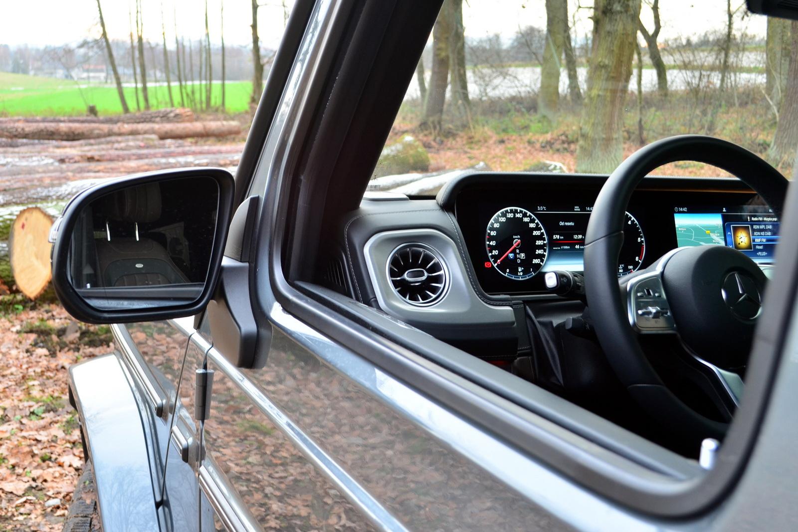 Mercedes Klasy G nigdy nie był samochodem małym. W swojej najnowszej odmianie jeszcze urósł, choć nieznacznie. Siedząc za kierownicą, od razu czuje się, że z tym autem nie ma żartów. Pudełkowate nadwozie zdaje się nie mieć końca, a jednocześnie jest doskonale wyczuwalne. Bez problemu da się określić, gdzie kończy się maska – bo, wraz z charakterystycznymi kierunkowskazami, w całości ją widać. Bez kamery cofania określimy też długość tylnej części nadwozia. Samochód kończy się po prostu tam, gdzie jego szyby. Duże powierzchnie przeszklone i ogromne lusterka pozwalają ocenić odległość do elementów otaczającego nas świata.