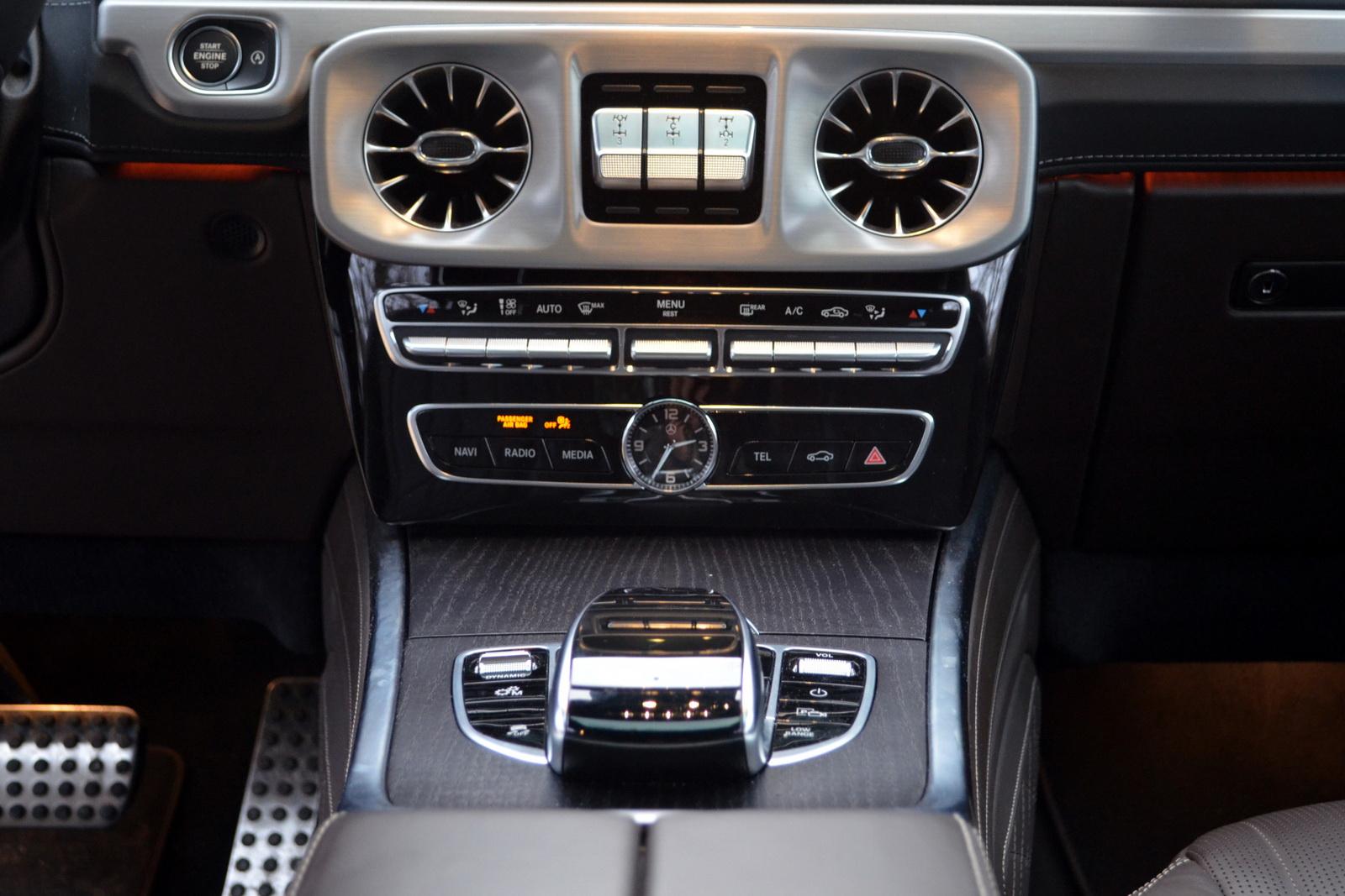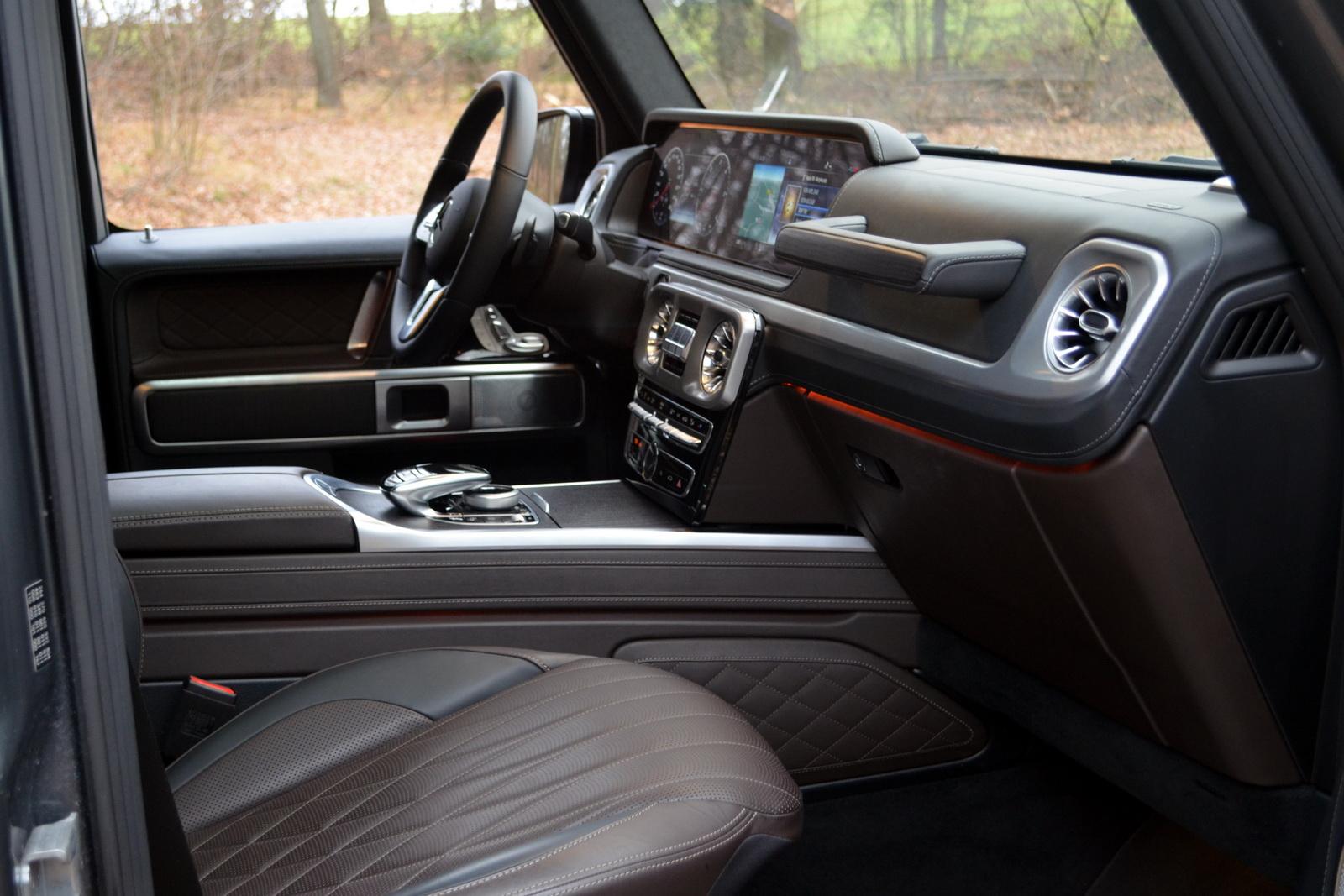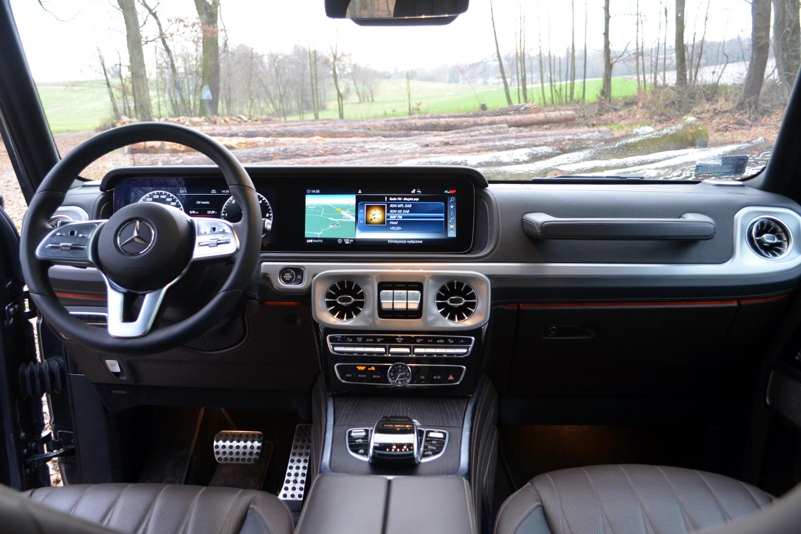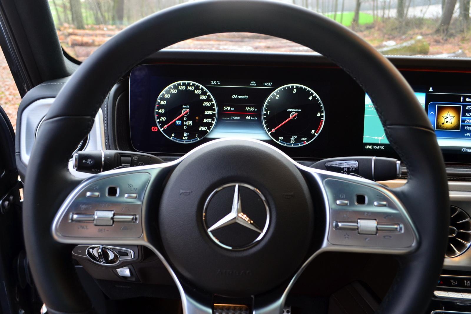 Nie da się w dzisiejszych samochodach całkiem uciec od elektroniki. W Gelendzie została ona jednak ujarzmiona. System inforozrywki jest nieprzeładowany i czytelny w obsłudze. Nie ma w nim też irytującego modułu MBUX, reagującego na komendę „hej Mercedes”. Dopiero jeżdżąc takim Mercedesem, można sobie zdać sprawę z tego, jak irytujący jest to system! Bardzo długie ekrany zegarów i infotainment ukryte zostały pod wspólnym daszkiem – tak, że żaden z nich nie wystaje ponad nią. Dzięki temu mamy spójny wygląd kokpitu, w którym nic nie wydaje się być dołożone w ostatniej chwili. Ogromne brawa dla Mercedesa za takie rozwiązanie. Czemu nie ma go w innych modelach? Ekrany nie są też dotykowe, dzięki czemu nie ubrudzą się natychmiast od odcisków palców. Do sterowanie funkcjami służą gładziki na kierownicy, na tunelu środkowym oraz osobne przyciski funkcyjne zgromadzone u dołu konsoli środkowej. Nad nimi znajduje się osobny panel sterowania klimatyzacją. Jedyna rzecz, której brakuje to wyraźnie zaznaczony włącznik świateł awaryjnych. O ile w nocy świeci się on mocnym czerwonym kolorem, o tyle w dzień niemal nie odróżnia się od pozostałych czarnych przełączników.