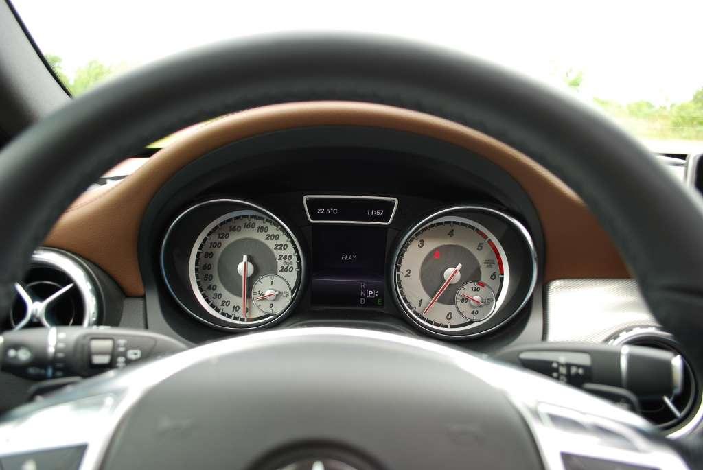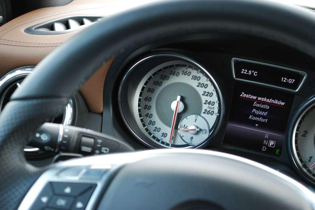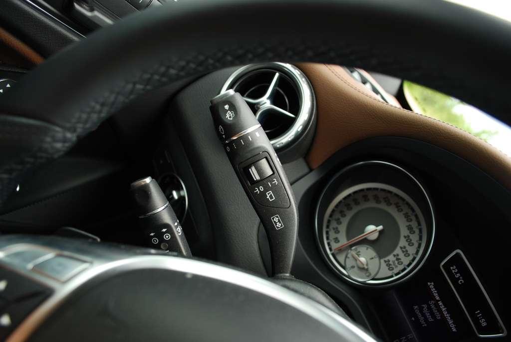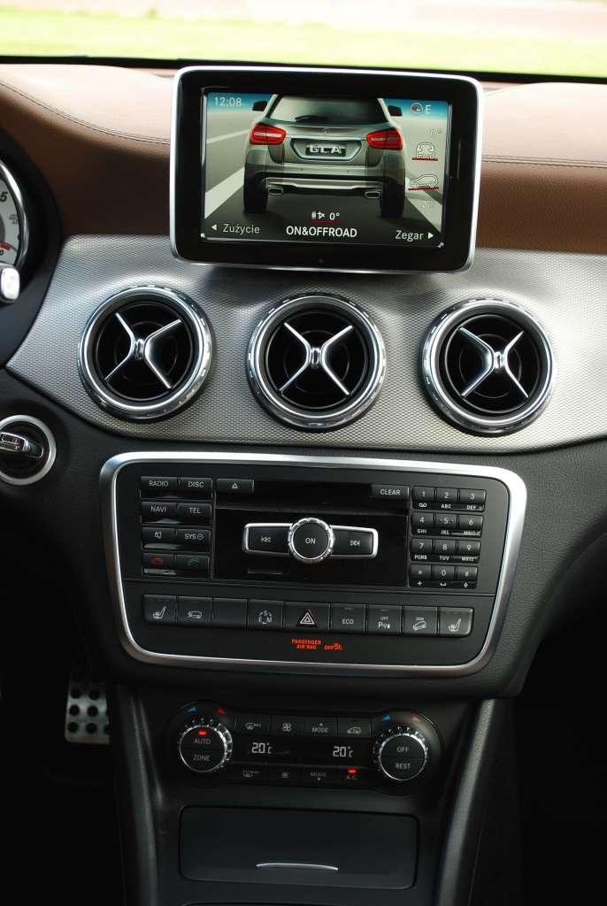 Ergonomia wnętrza nie budzi zastrzeżeń. Podstawowe przełączniki zostały optymalnie rozlokowane. Przyzwyczajenie się do – charakterystycznych dla Mercedesa – dźwigni przy kierownicy (selektora skrzyni biegów, włącznika tempomatu oraz manetki kierunkowskazów zintegrowanej z włącznikiem wycieraczek) przychodzi zaskakująco łatwo. System multimedialny, podobnie jak w innych autach segmentu Premium, obsługujemy wielofunkcyjnym pokrętłem. GLA nie otrzymało przycisków do włączania kluczowych zakładek, więc przejście z menu audio do nawigacji czy ustawień samochodu wiąże się z koniecznością wykonania nieco większej liczby kliknięć niż w Audi czy BMW, w których znajdziemy klawisze funkcyjne.