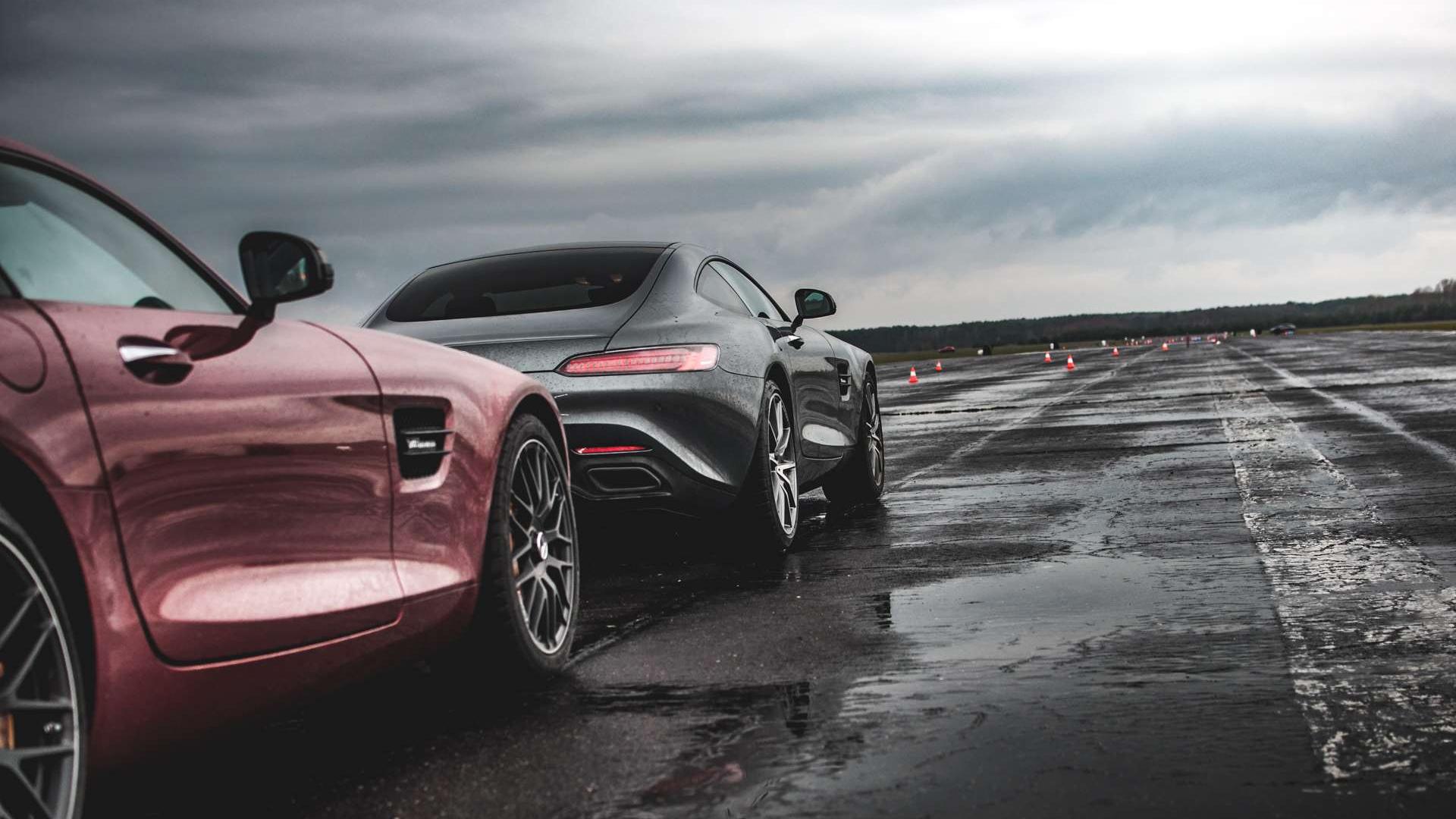 Mało kto potrafi tak dostroić dźwięk układu wydechowego, jak AMG. Na próbę wyjeżdżaliśmy dwoma AMG GT, dwoma CLS-ami 63S AMG i z instruktorem w CLA 45 AMG. Jak wataha wilków. Odpalenie silników wszystkich tych modeli naraz, to koncert dla uszu fana motoryzacji. Cztery widlaste ósemki o brutalnym brzmieniu. To musi się udać.