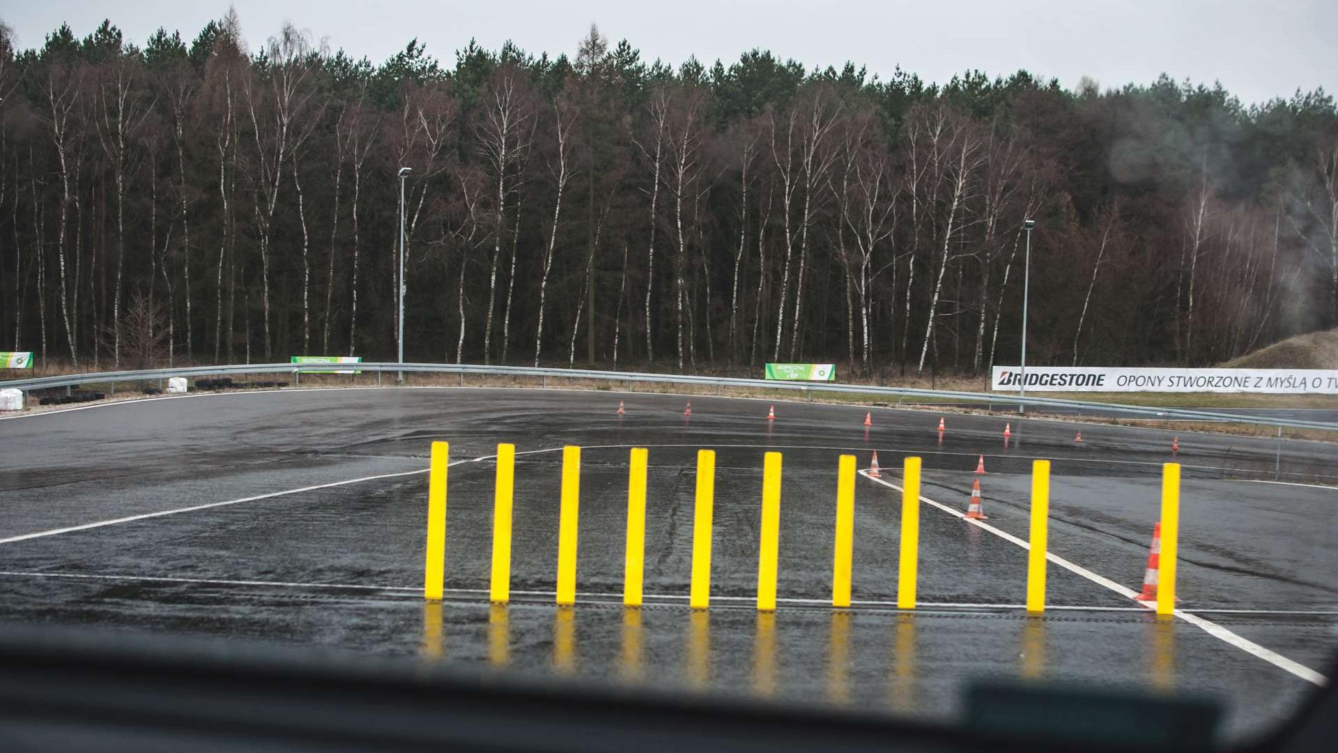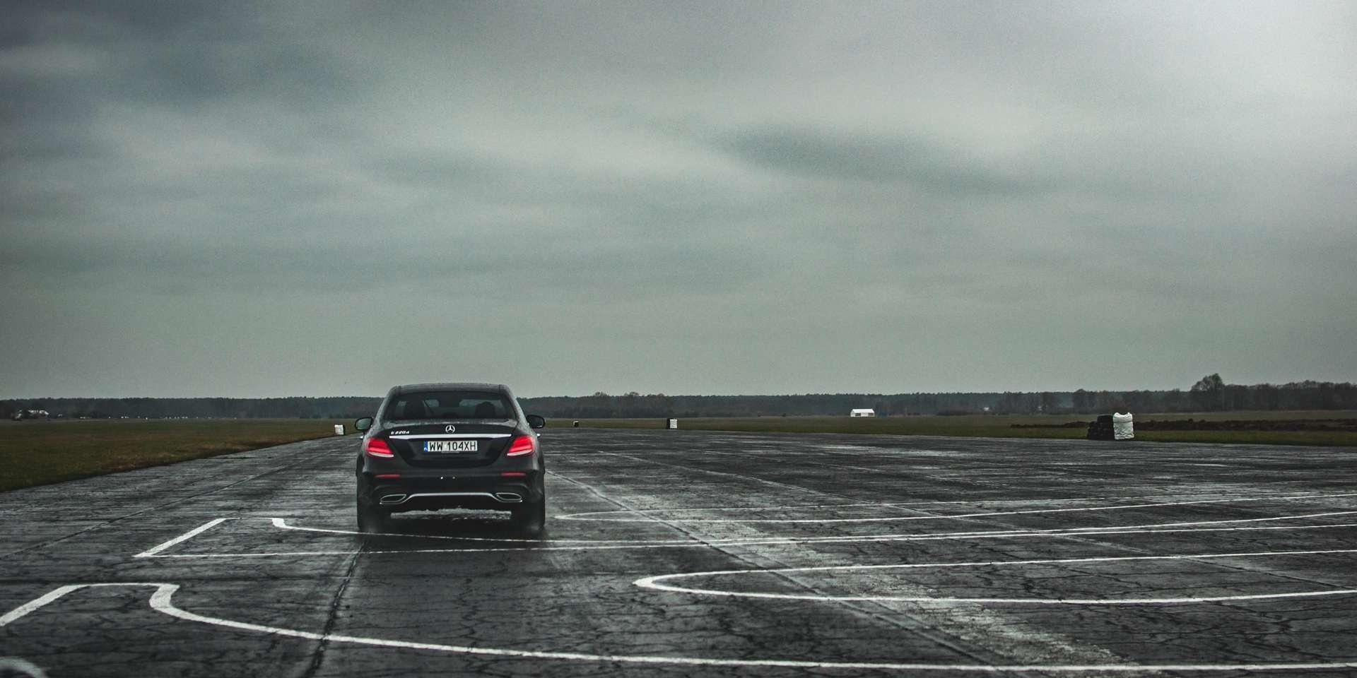 Kolejny punkt stanowiło hamowanie awaryjne z omijaniem przeszkody. Instruktorzy cały czas tłumaczyli nam, że dzisiaj nie hamuje się już tak, jak 30 lat temu. Jeśli samochód ma ABS, powinniśmy jak najmocniej wcisnąć hamulec i nie odpuszczać podczas omijania przeszkody. Wbrew pozorom ciężko jest się nagle wyzbyć takiego odruchu, ale jest to jak najbardziej możliwe. W Mercedesie klasy E, w standardzie obecny jest dodatkowo system Pre-Safe, który m.in. wpływa na siłę nacisku na hamulec. Jeśli zahamujemy zdecydowanie, ale za lekko względem sytuacji, elektronika zadba o odpowiedni docisk klocka hamulcowego do tarczy. I tu ponownie - taki układ ma pomagać, ale nie myśleć za nas. Jeśli więc w trakcie omijania przeszkody zmniejszymy siłę nacisku na hamulec, będzie to sygnał do anulowania ingerencji systemu. Przy takich manewrach bardzo pomaga też mniejsza masa. Klasa E została odchudzona o pokaźne 100 kg, co nie pozostaje bez wpływu na ogólnie rozumianą sterowność auta i jego odpowiedź na ruchy kierownicą, przenoszenie masy, itp. Mniejsza masa to zawsze mniejsza bezwładność. Aby poradzić sobie z tym ćwiczeniem, wystarczyło więc szybko zareagować i delikatnie operować kierownicą - nawierzchnia była mokra, a na dodatek w momencie omijania przeszkody zjeżdżaliśmy ze wzniesienia.