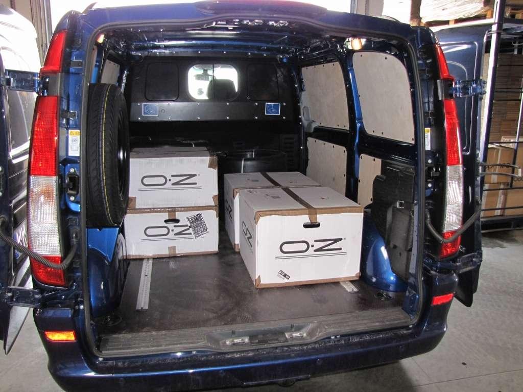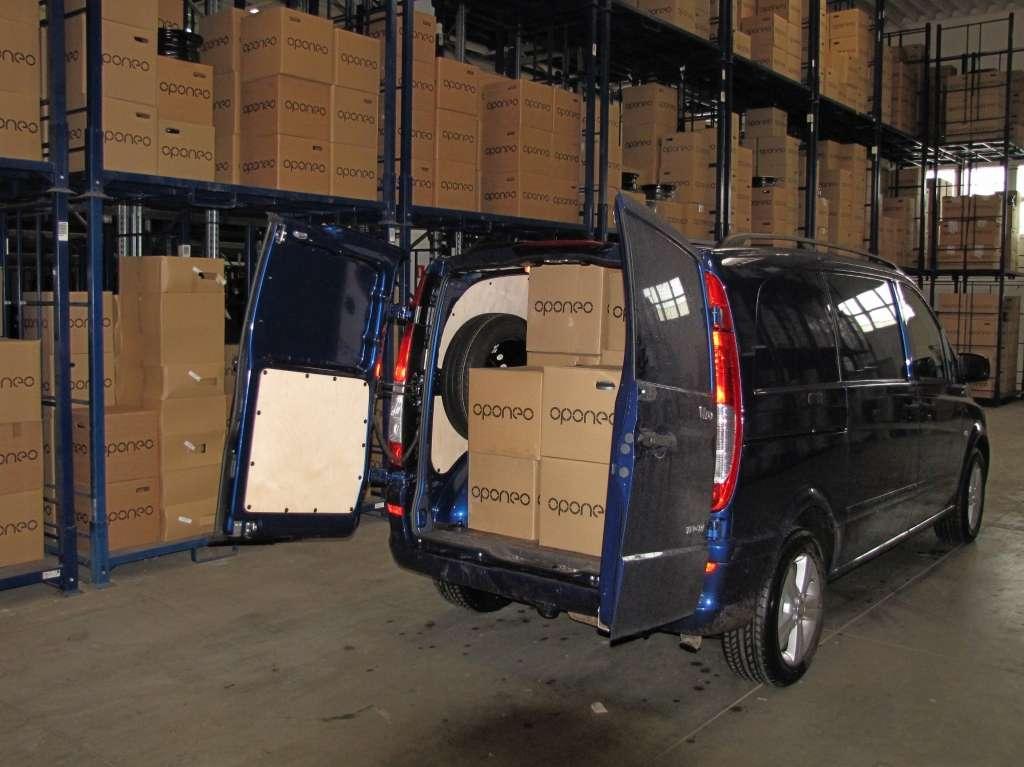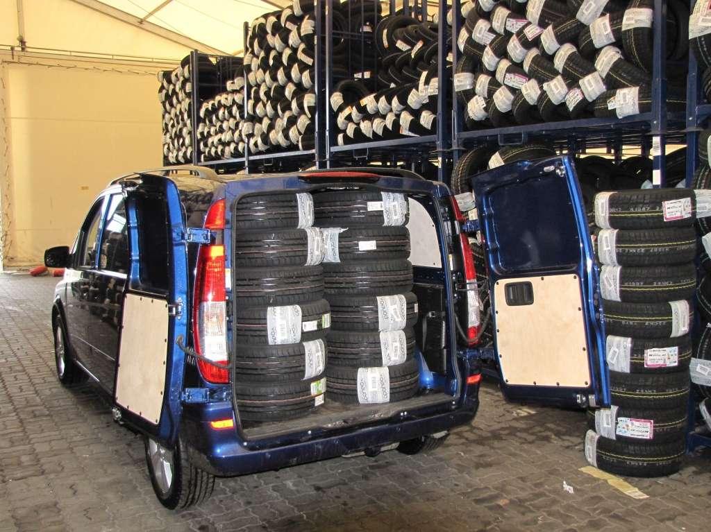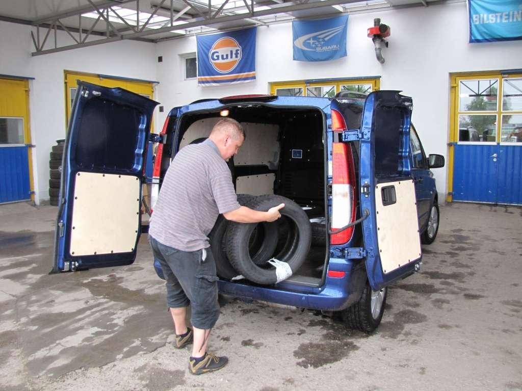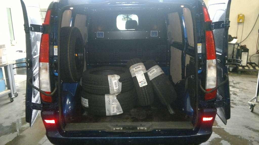 Vito oryginalnie wyposażone było w oczka zamocowane w podłodze służące do montażu przewożonych towarów. Obsługa aut z zakresu ogumienia oraz współpraca z dużym sprzedawcą internetowym wymaga od nas częstego przewozu opon oraz felg. Załadunek tez nie sprawiał większego problemu, cofnięcie pod regał z oponami nie było problemem, ponieważ otwierane na 270 stopni drzwi tylne idealnie to zadane ułatwiało.