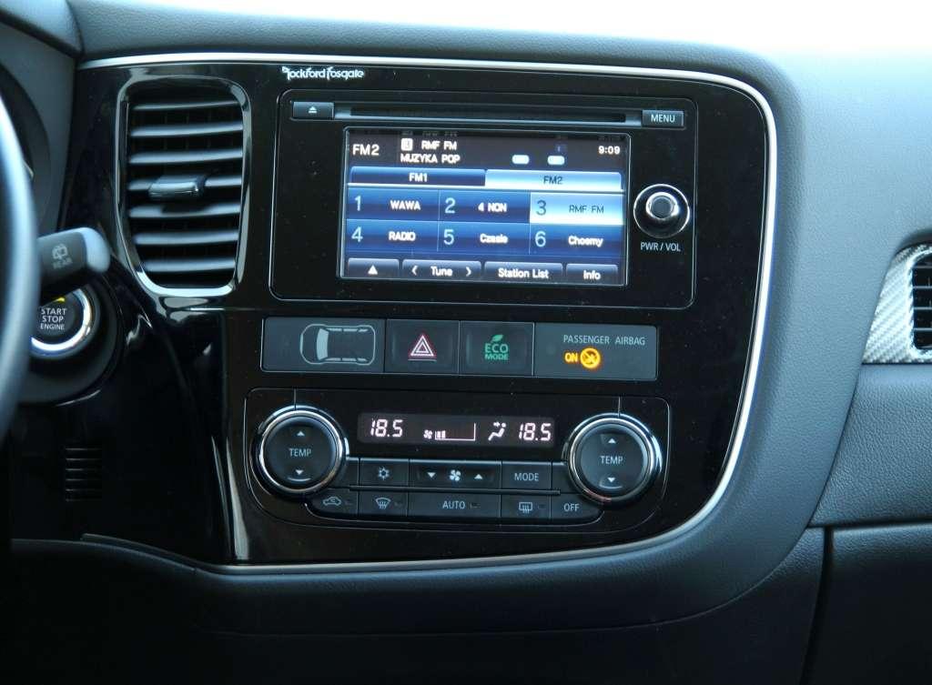 Outlander w wersji Invite Plus nie jest przesycony elektronicznymi gadżetami. Poza systemem audio z dotykowym ekranem, kierowca ma do dyspozycji przycisk włączający tryb Eco, który tłumiąc reakcję na gaz oraz ograniczając wydajność klimatyzacji, redukuje zapotrzebowanie na paliwo. Rzadko spotykanym udogodnieniem, jest ekonomizer – barwne diody w dolnej części tarczy obrotomierza informują, czy efektywnie wykorzystujemy jednostkę napędową. Szkoda, że bazowa wersja Invite Plus nie otrzymuje kolorowego wyświetlacza komputera pokładowego. Monochromatyczny ekran wygląda archaicznie.