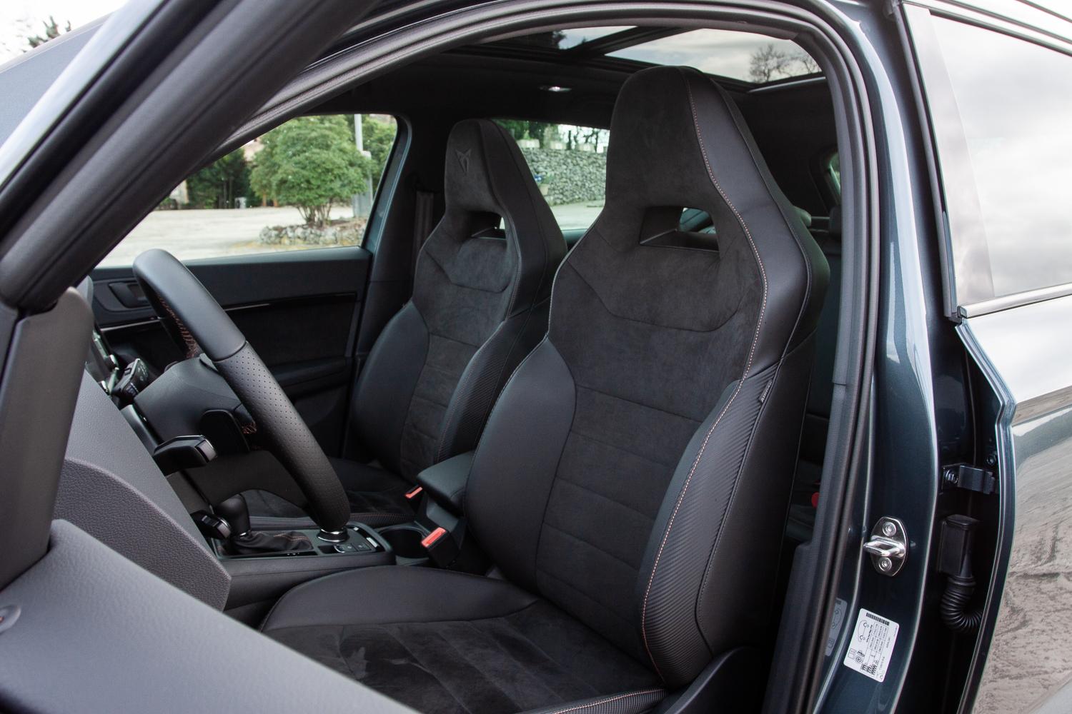 Na szczególną uwagę, jak to zwykle ma miejsce w usportowionych samochodach z logo Cupra, zasługują fotele. Mocno wyprofilowane, ze zintegrowanymi zagłówkami, a jednocześnie niesłychanie dobrze wyprofilowane. Zarówno szybka jazda na zakrętach jak i długie kilkusetkilometrowe trasy pokonywać można z przyjemnością i bez bólu kręgosłupa.