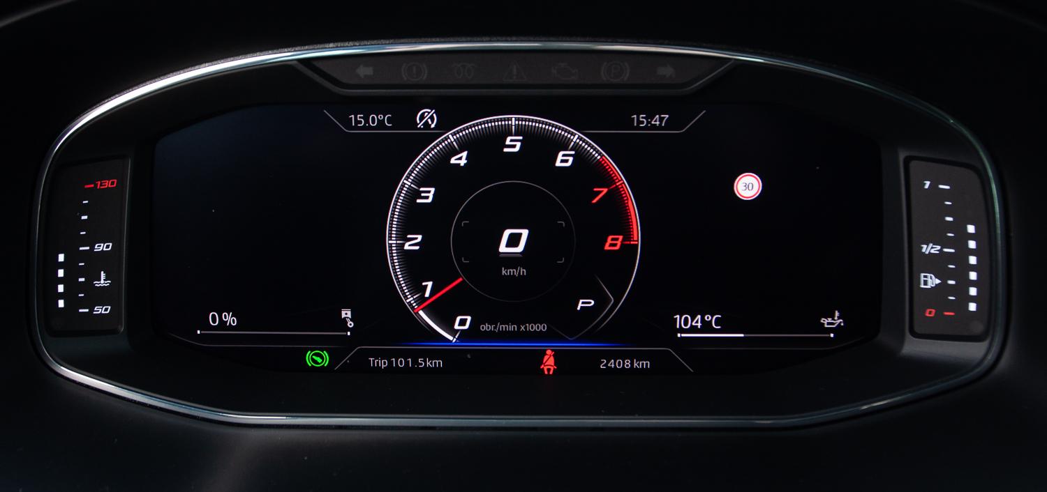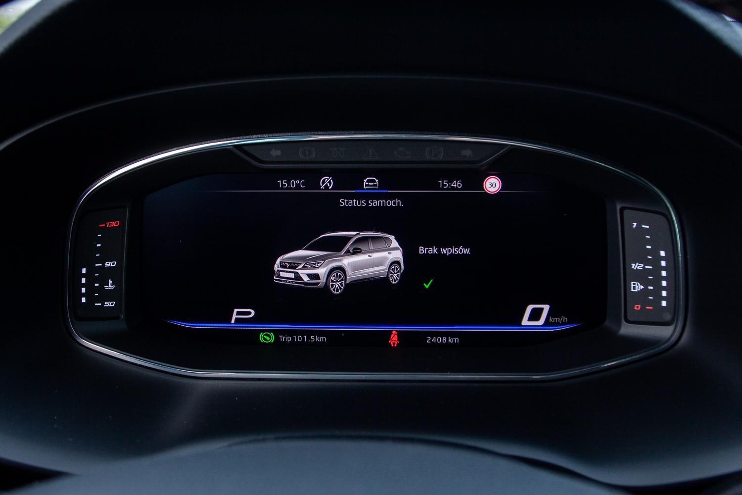 Cupra Ateca to nowoczesny, dobrze wyposażony samochód. Podobnie jak w Leonie Cupra, zagościł tutaj wirtualny kokpit, który ma wiele zmiennych opcji wyświetlania informacji. Na pokładzie egzemplarza testowego znalazł się komplet systemów bezpieczeństwa, z aktywnym tempomatem czy czujnikiem martwego pola. Nagłośnienie firmuje swoim logo Beats by Dr Dre.
