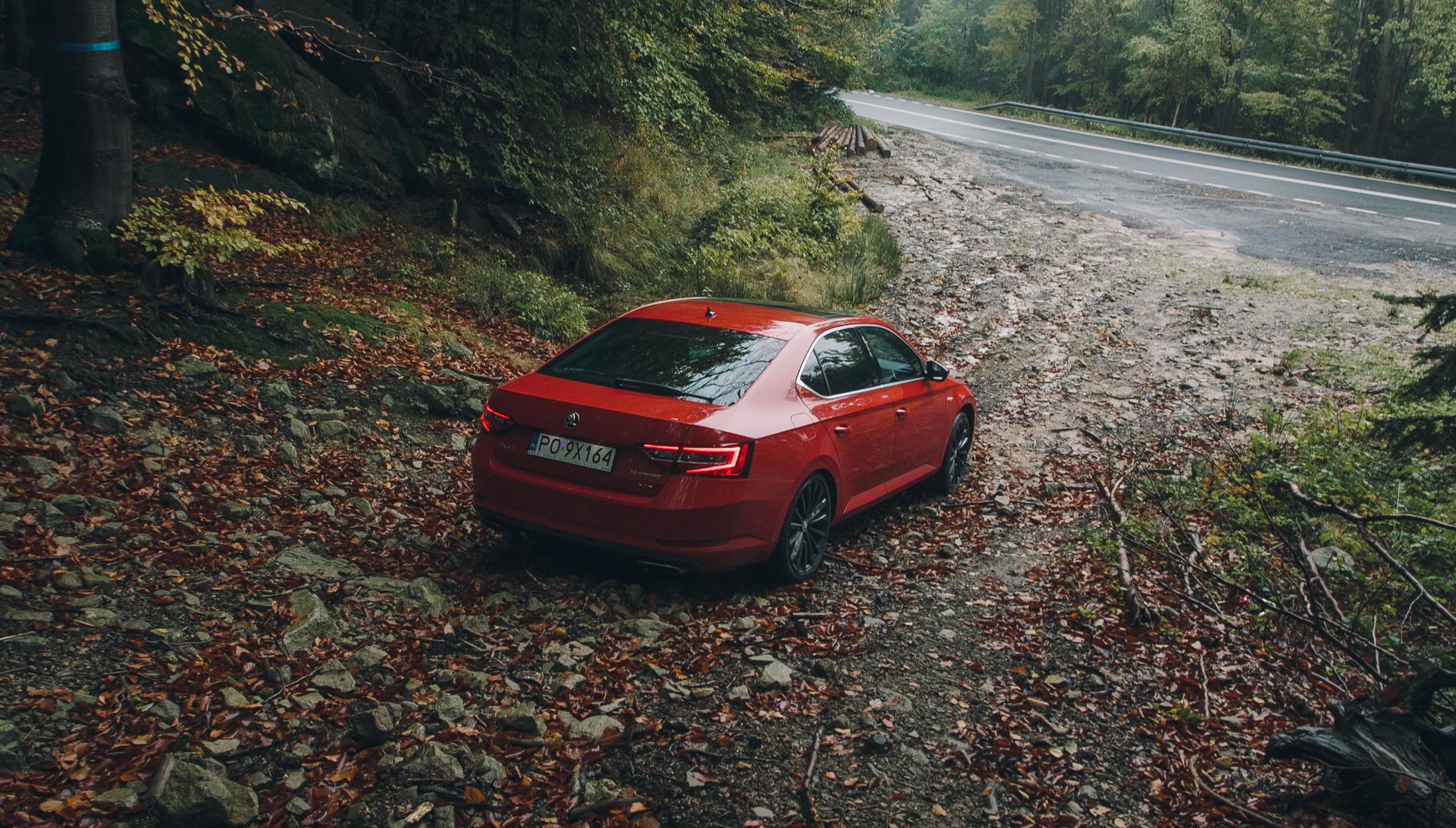 Z zewnątrz niemal nic nie zdradza faktu, że flagowy model Skody jest wyposażony w napęd AWD, poza plakietką „4X4” umieszczoną na tylnej klapie. W odróżnieniu do Octavii Scout, nie ma tutaj żadnych osłon zderzaków czy nadkoli, a zawieszenie nie zostało podniesione. Superb nie nadaje się do jazdy w terenie, stąd też rodzi się pytanie, kiedy tak naprawdę napęd na cztery koła okazuje się faktycznie przydatny? Czy na asfaltowych drogach, podczas codziennej eksploatacji możemy poczuć jakąkolwiek różnicę? Jesienna pogoda bywa kapryśna, częste opady deszczu, pojawiająca się raz na jakiś czas poranna i wieczorna gołoledź oraz zalegające na nawierzchni liście sprawiają, że o poślizg bardzo łatwo.
