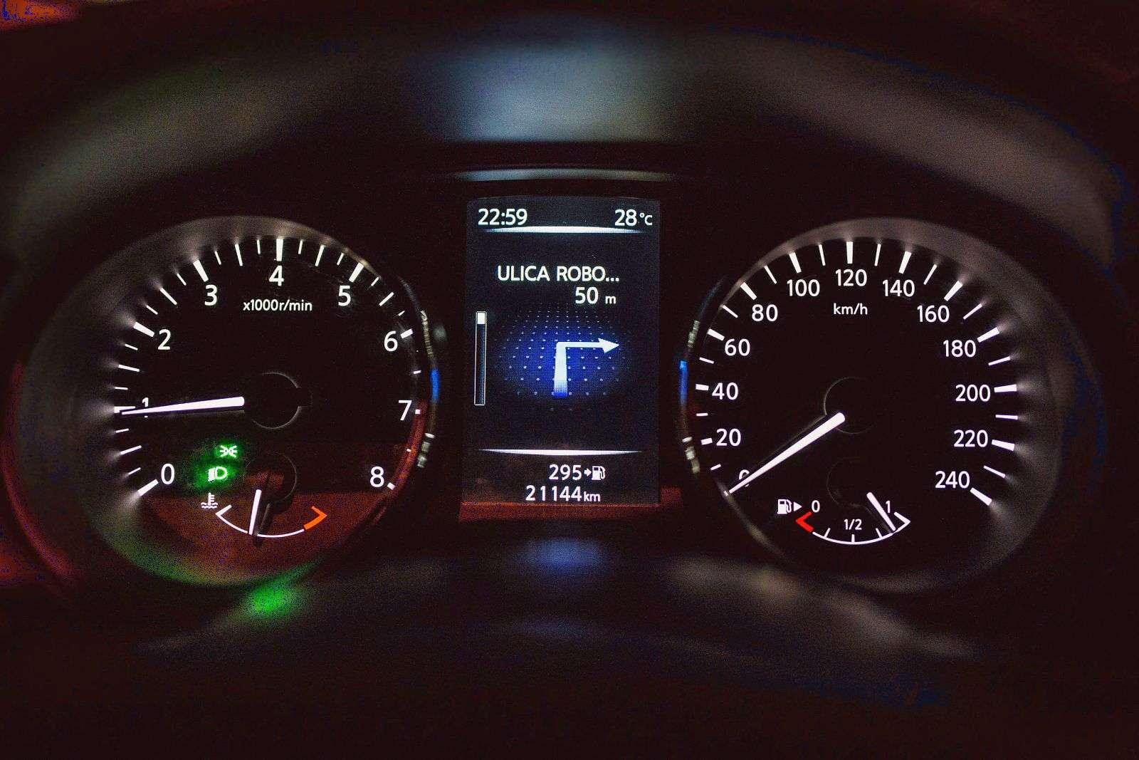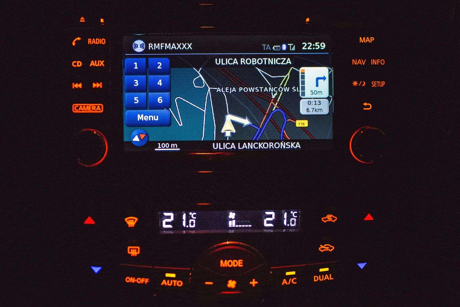 Jakby na sprawę nie patrzeć, nie można japońskiemu wynalazkowi odmówić praktyczności. Duże, czytelne zegary uzupełnia 5-calowy wyświetlacz, który w płynny sposób przekazuje informacje z konsoli centralnej. Ta nie pochwali się wysoką rozdzielczością, ale nadrobi płynnością działania i skutecznością nawigacji. Porównanie pokładowego GPS-a z Google Maps na trasie z jednego końca Krakowa na drugi wykazało stuprocentową zbieżność. Parowanie telefonu, odtwarzanie muzyki i zmienianie ustawień w menu - wszystko to odbywało się intuicyjnie, bez potrzeby wertowania zakładek na chybił trafił.
