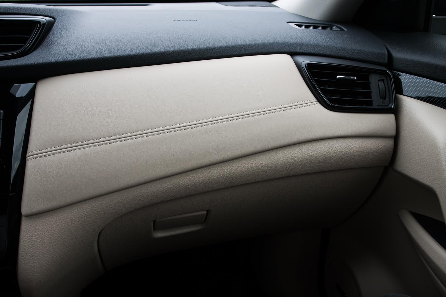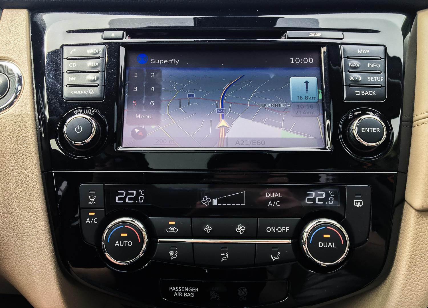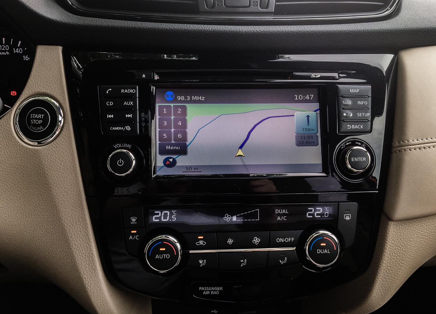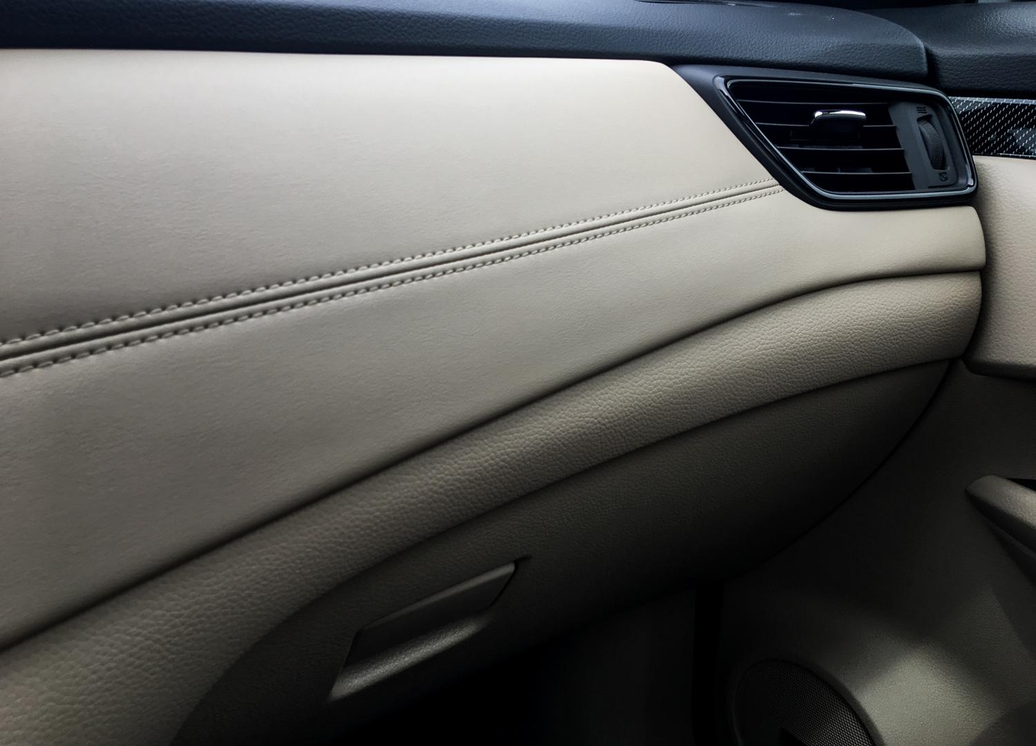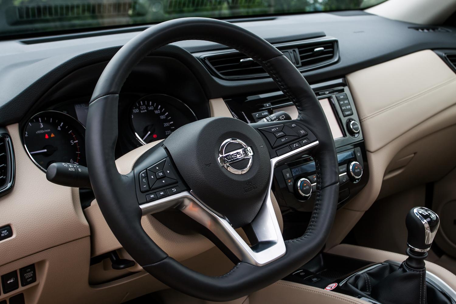 Wewnątrz największą zmianą jest zaprojektowana od nowa kierownica, znana już z modeli Micra i Qashqai – wygląda o niebo lepiej od stosowanej dotychczas i to właśnie ten element wprowadza X-Traila we współczesność. Wieniec kierownicy ma kształt litery „D”, bardzo dobrze leży w dłoniach. Przyciski sterujące między innymi tempomatem, telefonem i radiem są czytelne, dobrze usytuowane i łatwo się przyzwyczaić do ich rozmieszczenia. Zmianą we wnętrzu jest pokrycie większej ilości elementów skórą (w topowej wersji wyposażenia TEKNA), a boczki drzwi udekorowane są elementami lakierowanymi w strukturę włókna węglowego – w naszej ocenie niepotrzebne „udawanie” – fortepianowa czerń by wystarczyła. Kształt deski rozdzielczej i umiejscowienie instrumentów, system multimedialny, a nawet nawiewy i przełączniki pozostały bez zmian. W tej kwestii nie jest źle, ale gdzieniegdzie materiały wykończeniowe mogły zostać zamienione na lepsze jakościowo. Jedną z rzeczy, którą można zakwalifikować do zmiany jest wysokość lewarka manualnej skrzyni biegów – jest nienaturalnie długi.