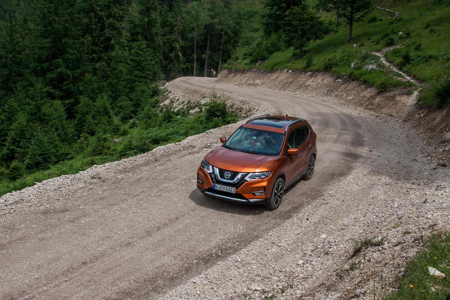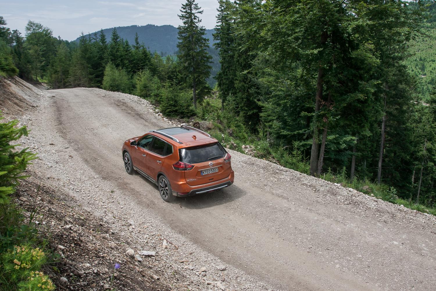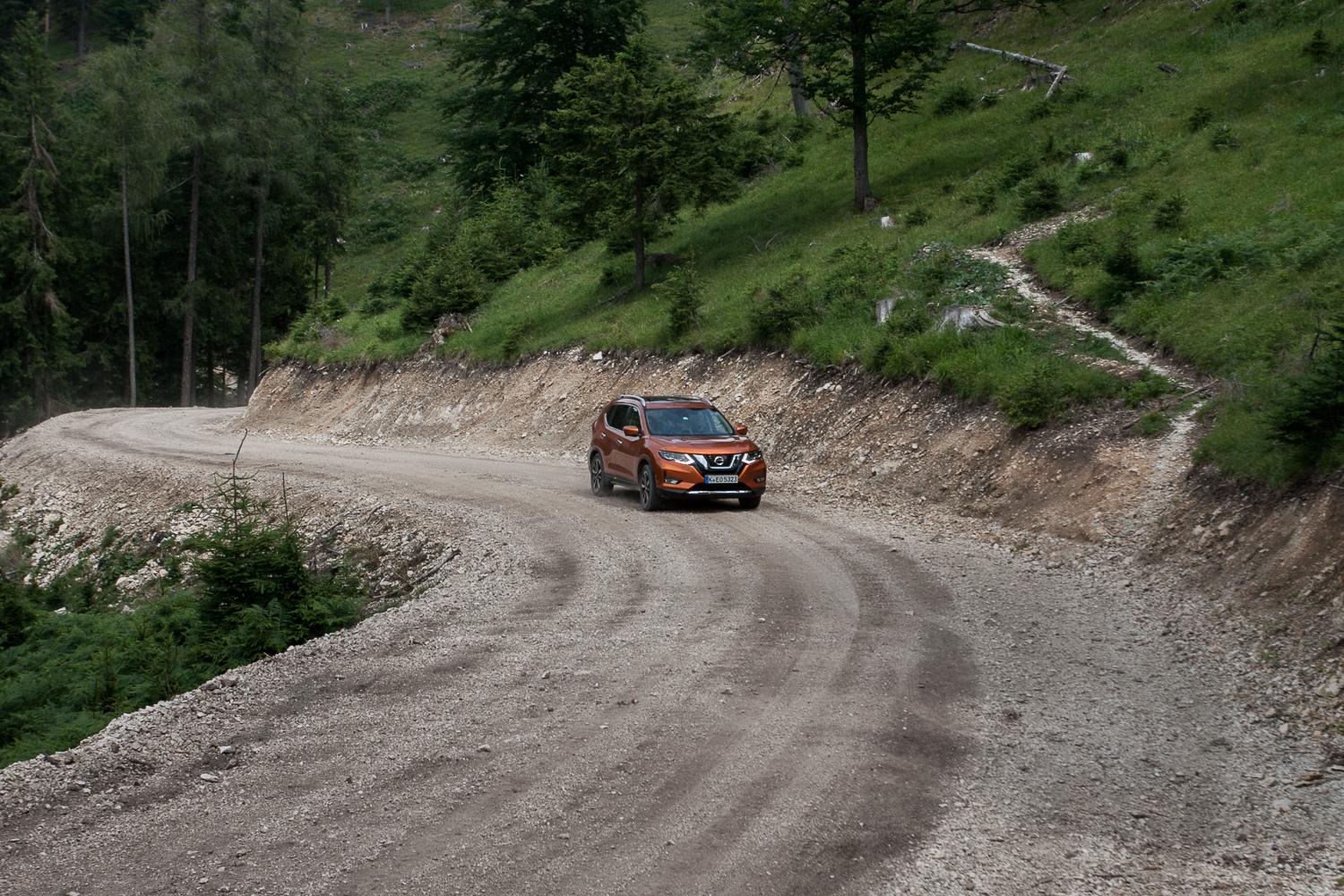 Co dzieje się podczas jazdy na nieutwardzonych drogach? Przede wszystkim, warto wyłączyć kontrolę trakcji, żeby poczuć działanie napędu 4X4. Kiedy testowaliśmy samochód na dość długim offroadowym odcinku w górach niedaleko Wiednia, szybka trasa z wieloma ostrymi zakrętami i przewyższeniami oraz sypka kamienista nawierzchnia doskonale zweryfikowały faktyczną przydatność napędu na obie osie. Co ciekawe, można w pełni zaufać systemowi automatycznie sterującemu przeniesieniem napędu (zblokowanie napędu 4X4 jest możliwe do prędkości 40 km/h), który w optymalny i błyskawiczny sposób przekazuje moc i moment obrotowy tam, gdzie jest najbardziej potrzebny. Wielkie zdziwienie spowodowały obserwacje elektronicznego wykresu, który wskazuje w czasie rzeczywistym, na którą oś przekazywany jest napęd. Zdumiewające, że nawet w subiektywnie trudnych warunkach moc była przenoszona niemal w 90% na przednią oś, a mimo tego X-Trail dzielnie wychodził z każdej opresji.