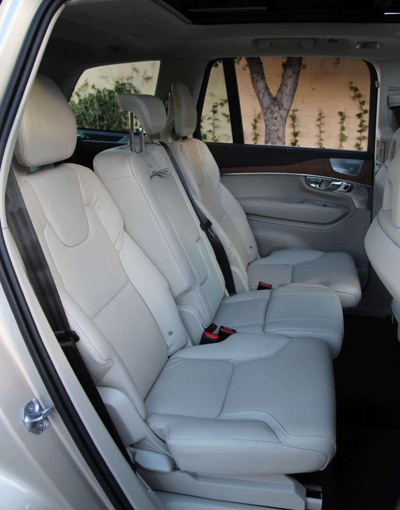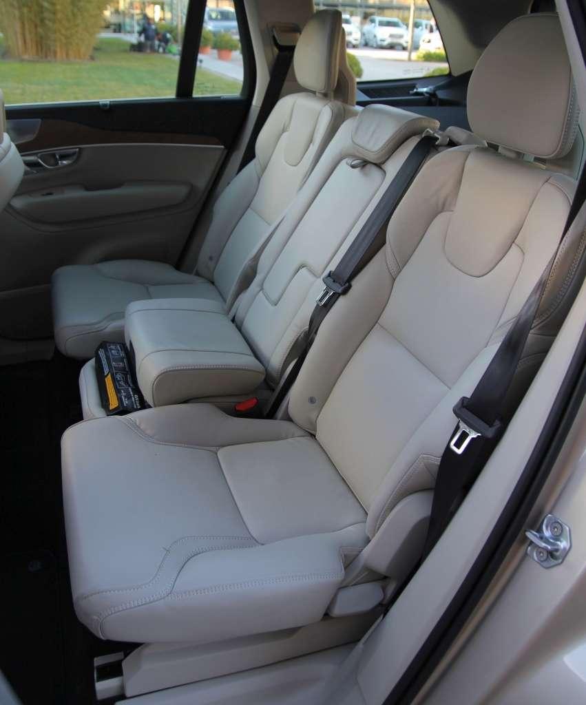 Wnętrze długiego na pięć i szerokiego na dwa metry XC90 jest bardzo przestronne. W segmencie pełnowymiarowych SUV-ów dużą ilość miejsca w dwóch pierwszych rzędach siedzeń trudno uznać za zaskoczenie. Większą niespodzianką są w pełni funkcjonalne dodatkowe siedzenia w bagażniku. Miejsca na nogi jest sporo, a sposób kotwiczenia foteli drugiego rzędu nie zmusza do szukania przestrzeni na stopy. Osoby o wzroście poniżej 170 cm nie powinny narzekać na przestrzeń na głowę. Komfort podnoszą boczne podłokietniki, nawiewy oraz uchwyty na kubki. Nie bez znaczenia jest też fakt, że nawet przy komplecie pasażerów XC90 jest w stanie pomieścić 451 litrów bagażu. Minus za brak skrytki na roletę.