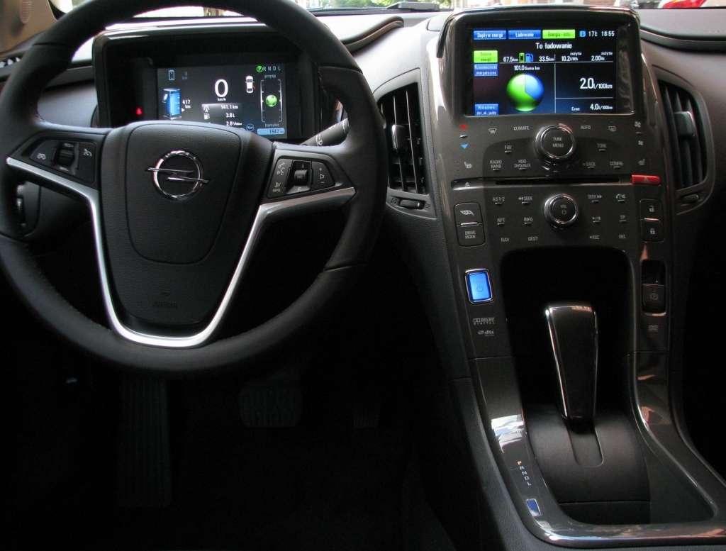 Wnętrze samochodu zaskakuje nietypowym pokryciem deski rozdzielczej i dotykową centralną konsolą. Nie dotykowym ekranem na konsoli, ale powierzchnią, na której zamiast przycisków są tylko nazwy poszczególnych funkcji, którymi steruje się dotykając odpowiedniego miejsca na desce. Trudniej popsuć, łatwiej czyścić, a do tego niezaprzeczalny efekt kosmicznej technologii przyszłości. Z całkiem tradycyjnego punktu widzenia cieszy funkcjonalność. Pod centralną konsolą jest spora półka dostępna z trzech stron. Na tunelu między fotelami jest półka, dwa miejsca na kubki i schowek w podłokietniku. Tunel ciągnie się także między tylnymi fotelami (auto jest czteroosobowe) i tam także jest półka z gniazdem 12V i dwa uchwyty na kubki. Za nimi jest całkiem spory bagażnik. Nie jest zbyt głęboki, bo pod nim znajdują się akumulatory, podobnie zresztą jak pod tunelem między tylnymi fotelami. Bagażnik ma pojemność 310 l, a składając oparcia tylnych foteli można zwiększyć ją do 1005 l. Rozstaw osi Ampery jest identyczny, jak w Astrze IV, więc z tyłu mamy miejsce podobne wielkością do kompaktowych aut – wyżsi pasażerowie mieszczą się bez problemu, ale i bez dużego komfortu.