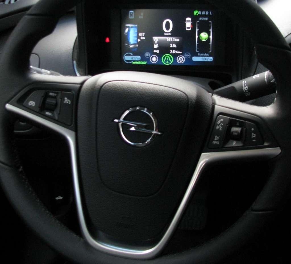 Auto rusza płynnie i bardzo cicho. Na centralnej konsoli jest przycisk pozwalający zmieniać tryby jazdy. Do wyboru są cztery. Dwa najważniejsze, które zdaniem inżynierów Opla będą wykorzystywane w 90 proc. czasu jazdy to normalny i sportowy. Dwa pozostałe mają dotyczyć szczególnych sytuacji. Tryb do jazdy w górach ma poprawić wykorzystanie energii przy długich podjazdach. Powinno się go włączyć kwadrans przed wjazdem w góry. Natomiast tryb Hold- charge pozwala wykorzystywać energię produkowaną przez silnik spalinowy nawet wówczas gdy akumulatory są pełne. W normalnych warunkach samochód wykorzystuje przede wszystkim energię z akumulatorów, a silnik spalinowy włącza dopiero wtedy, gdy ilość energii w bateriach spada poniżej wymaganego poziomu.