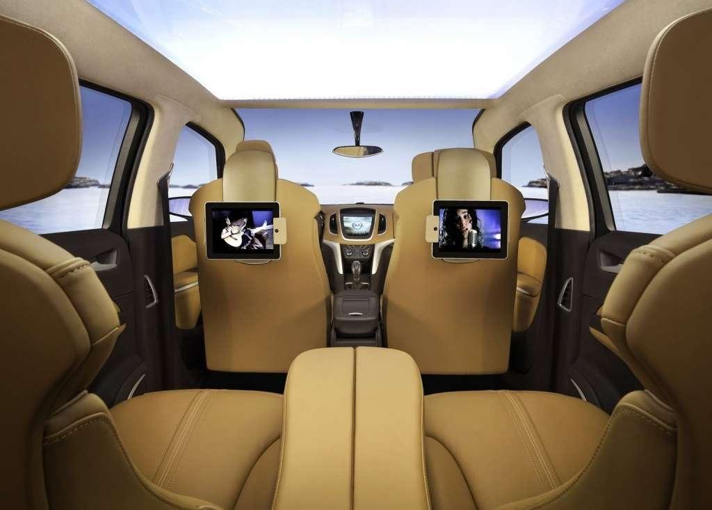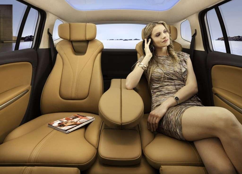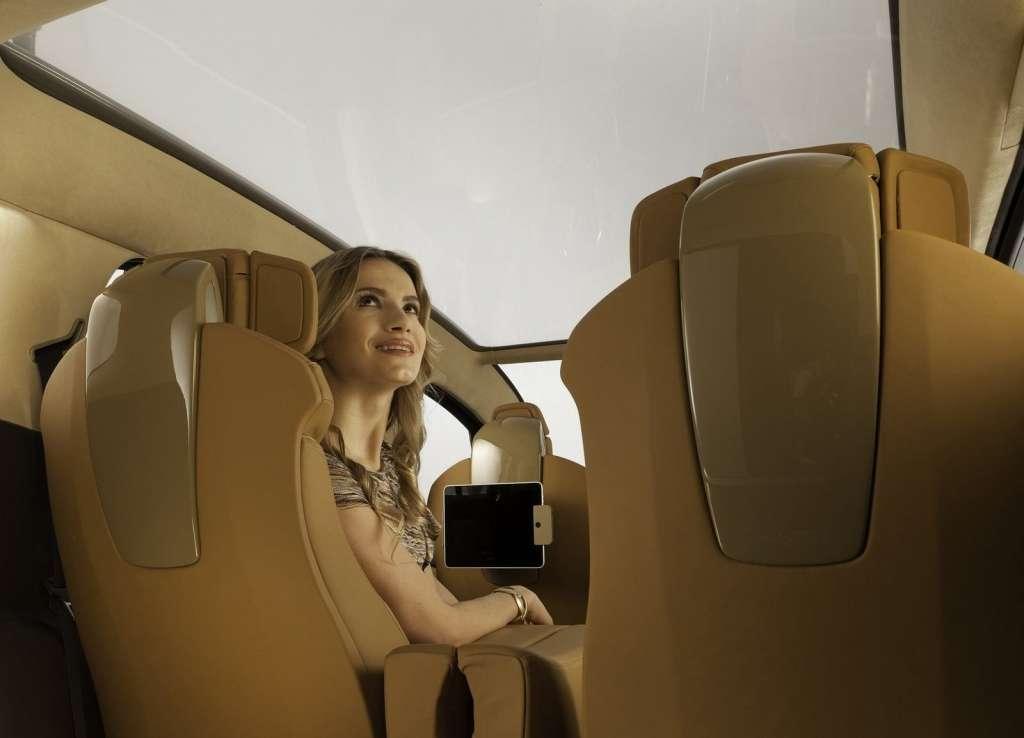 Bardzo ciekawym rozwiązaniem są elektrycznie regulowane zagłówki. Trzyczęściowa konstrukcja może być obracana wokół środkowej części, a więc ustawiana pionowo lub poziomo. Skrajne elementy można zaginać, otaczając głowę i podnosząc komfort wypoczynku. To rozwiązanie zapożyczone z foteli niektórych samolotów pasażerskich. Dodając do tego rozkładane podnóżki otrzymujemy bardzo komfortowe , a nawet wypoczynkowe warunki podróżowania. Podczas jazdy zagłówek fotela kierowcy pozostaje w pozycji pionowej. Konstruktorzy bali się zapewne, że w zbyt komfortowych warunkach kierowca zaśnie. Na tylnych płaszczyznach przednich foteli umieszczono ruchome uchwyty do zamocowania tabletów, które pozwalają pasażerom korzystać z Internetu czy multimedialnego wyposażenia samochodu. Głównym elementem centralnej konsoli jest dotykowy ekran. Nad nim jest schowek, w którym może się zmieścić tablet, pod nim natomiast panel sterowania klimatyzacją. To także dotykowy panel, na którym są dodatkowo dwa pokrętła regulacji temperatury.