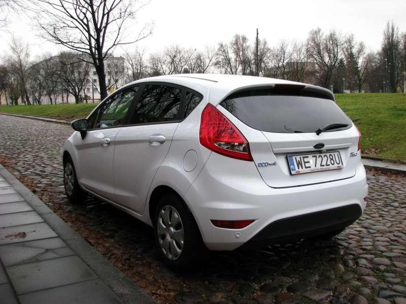 Nadwozie samochodu było malowane na kolor Frozen White, czyli zmarzniętej bieli. Faktycznie, kiedy oddawałem auto kraj walczył z pierwszym atakiem zimy – podróż do Warszawy, zwykle trwająca jakieś 4 godziny tym razem zajęła mi bite 12 godzin. Miałem dużo czasu na docenienie prostoty obsługi zestawu audio, skutecznego ogrzewania zapewnianego przez dwustrefową, automatyczną klimatyzację i wygody foteli. Mowa o fotelach przednich, bo tylna kanapa już dla wysokich pasażerów jest nieco ciasna. Z zimowych przyjemności Fiesta oszczędziła mi skrobania przedniej szyby – zestaw cieniutkich drucików zatopionych w szkle w ciągu kilkudziesięciu sekund radził sobie z cienką warstwą lodu na szybie. To niestety opcjonalne wyposażenie, podobnie jak opisane wyżej radio, automatyczna klimatyzacja czy wspomaganie cofania z kamerą i ekranem we wstecznym lusterku. W standardowym wyposażeniu są 2 poduszki powietrzne, system stabilizacyjny ESP, elektryczne wspomaganie kierownicy, centralny zamek, elektrycznie sterowane i podgrzewane lusterka oraz wlew paliwa Easy Fuel. To ostatnie rozwiązanie to cechy ostatnich modeli Forda – nie trzeba odkręcać korka wlewu paliwa, a przede wszystkim nie da się pomylić pistoletów na stacje benzynowej. Specjalnej konstrukcji klapka odblokowuje wlew tylko jeżeli naciskamy na nią odpowiednim pistoletem, nie da się wcisnąć pistoletu z dystrybutora oleju napędowego do wersji benzynowej i odwrotnie.