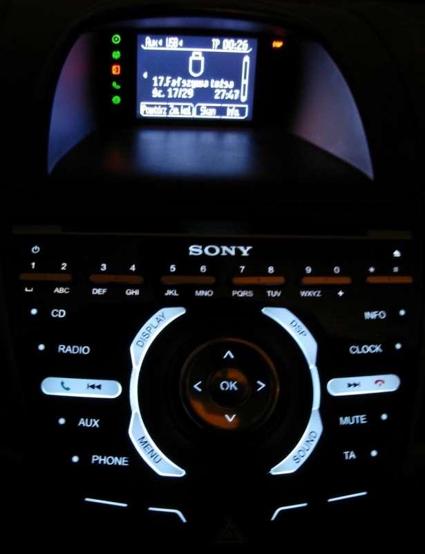 Centralna konsola jest zwarta i mocno wysunięta do wnętrza samochodu. W testowanym aucie w zasadzie całość zajmuje zestaw audio firmy Sony, oferowany jako wyposażenie dodatkowe. Jest bardzo ciekawie zaprojektowany, z myślą o ułatwieniu obsługi pokoleniu wychowanemu na telefonach komórkowych i przenośnych odtwarzaczach MP3. Zresztą dzięki gniazdom AUX i USB tego typu urządzenia można wpinać w zestaw i odtwarzać znajdujące się na nich pliki. Zestaw wygląda atrakcyjnie zwłaszcza w ciemności, gdy są podświetlone jego duże klawisze z białego, przyjemnego w dotyku tworzywa. Obsługa zestawu jest łatwa i raczej intuicyjna. W kabinie jest sporo niezbyt dużych, ale funkcjonalnych schowków. Na tunelu między przednimi fotelami są dwa uchwyty na kubki, a w jej tylnej części większa półka z miejscem na kubek, która jest dostępna dla pasażerów tylnej kanapy.