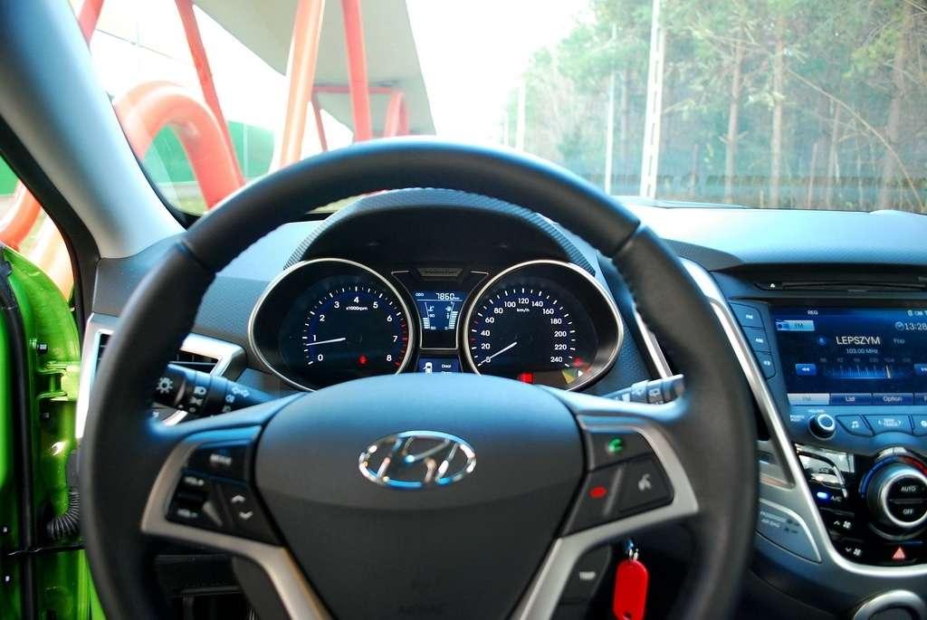 Jeśli chodzi o jakość materiałów wykończeniowych, to jest tu trochę niespójnie. Deska rozdzielcza pokryta plastikiem przypominającym kevlar jest twarda, ale nie skrzypi. Rączka do zamykania drzwi lekko wygina się, ale nie zdołałem jej urwać podczas testu. Na pochwałę zasługuje bardzo miła w dotyku skórzana kierownica, czytelne zegary, dobrze trzymające ciało fotele i ogólne spasowanie elementów wnętrza. Krótko mówiąc nie jest źle, ale Hyundai ma tu jeszcze spore pole do popisu.
