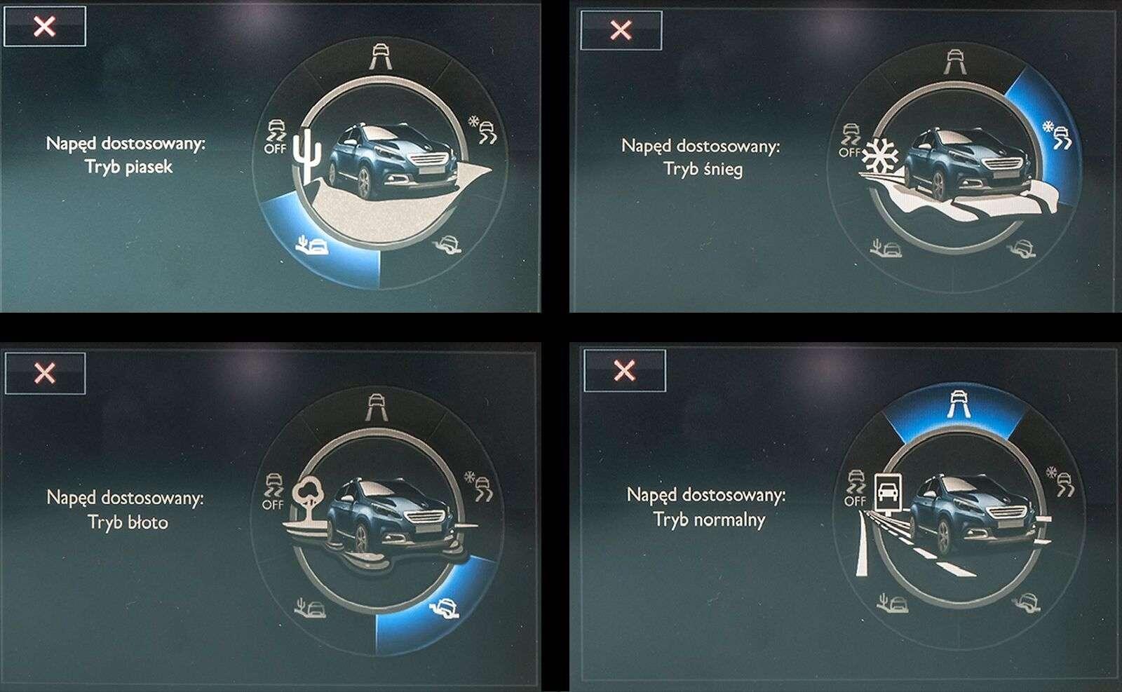 Na tunelu środkowym znalazło się miejsce na pokrętło służące do zmiany trybów jazdy. Wyglądem przypomina nieco przełącznik służący do załączania napędów w terenówkach. Za jego pomocą zmienimy jednak tylko nastawy pracy układu napędowego. Mamy do wyboru 5 trybów: normalny, śnieg, błoto, piasek oraz opcję wyłączenia ESP. Z racji testowania auta późną wiosną, zrezygnowaliśmy z włączania opcji śnieg. Jednak aby sprawdzić, czy tryb „piasek” nie występuje tu tylko dla ozdoby, zjechaliśmy z utwardzonej drogi, by udać się w okolice podwarszawskiego poligonu. Oczywiście ze względu na prześwit nie mogliśmy zagłębiać się zbyt daleko. Należy w końcu pamiętać, że Peugeot 2008 to miejski crossover i ewentualnie pożeracz krawężników, a nie pogromca bezdroży. Ale skoro producent twierdzi, że powinien poradzić sobie w piaszczystym terenie, to dlaczego by tego nie sprawdzić? Po przekręceniu pokrętła w pierwszej chwili nie zmienia się absolutnie nic. Nie wyrosły mu dodatkowe koła, bieżnik nie napuchł. Jednak poruszając się po miałkim piachu łatwo zauważyć nieco ospałą reakcję na naciśnięcie pedału przyspieszania. Dzieje się tak za sprawą układu Grip Control, który optymalizuje pracę przedniej osi tak, aby zapewnić jak najlepszą trakcję na każdym rodzaju podłoża. Układ ten jest dostępny jedynie dla wersji z silnikami o mocy powyżej 100 koni mechanicznych, zarówno z manualną jak i automatyczną skrzynią biegów.