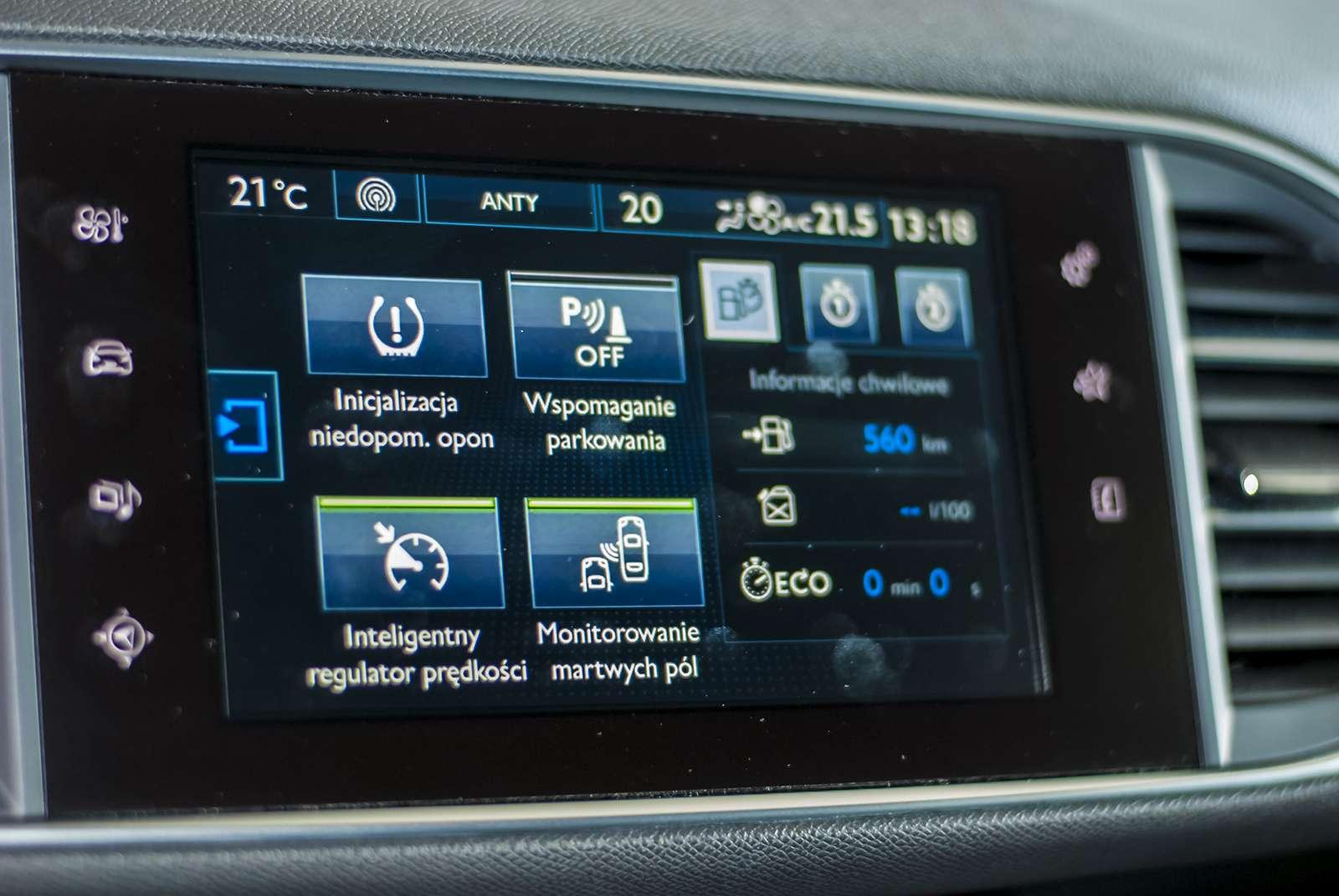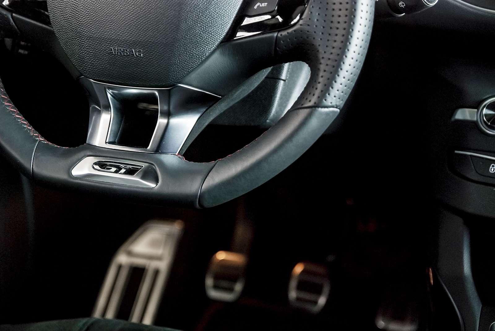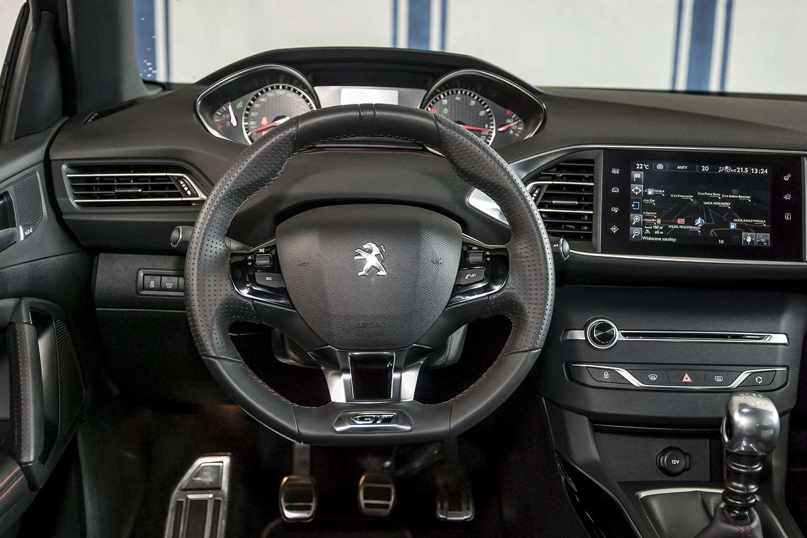 Wnętrze 308 GT jest klasyczne i stonowane. Kolorystycznie dominuje czerń, a czerwone przeszycia i wszechobecne aluminiowe wstawki dodają mu elegancji i szyku. Uwagę z pewnością przykuje kierownica, która w pierwszej chwili może wydawać się „jajowata”, stanowczo za mała i zbyt nisko umiejscowiona. Jednak już po kilku zakrętach okazuje się, że jest ona jedną z lepszych jakie kiedykolwiek trzymaliśmy w dłoniach. Z pewnością jest oryginalna, bo podobnej nie znajdziemy w żadnym innym samochodzie. Z jej poziomu możemy sterować podstawowymi ustawieniami radia. Brak tysiąca przycisków wielkości łebków od szpilki to z pewnością atut.