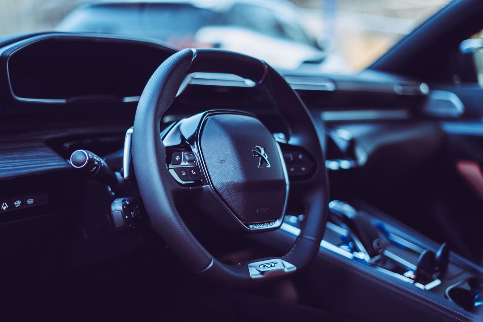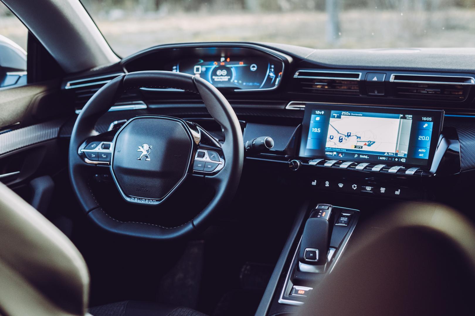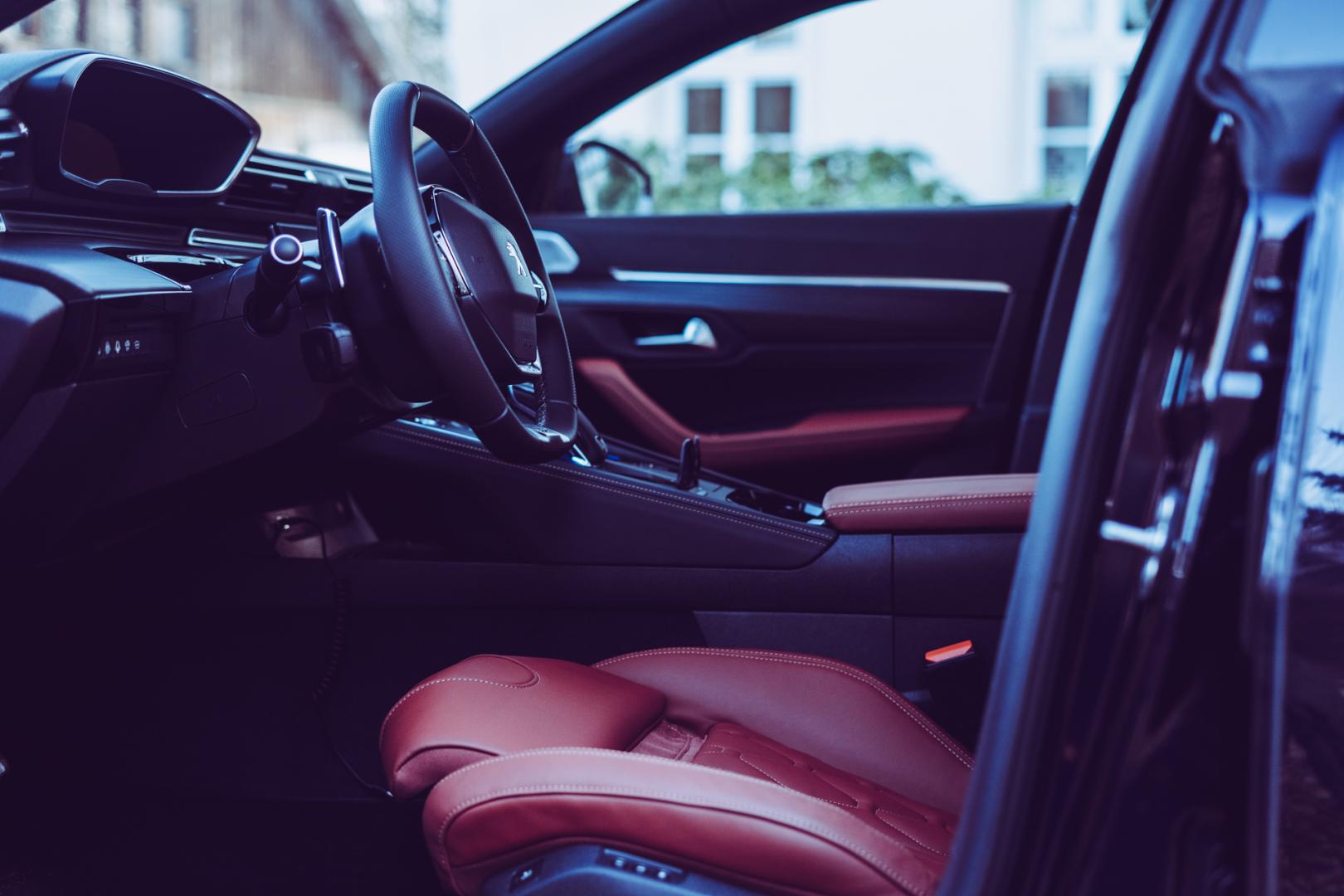 Wnętrze może zostać wykończone ładną skórą, a szczególnie dobre wrażenie robi z tapicerką w wiśniowym kolorze. Jak na Peugeota przystało, kierownica jest odpowiednio mała, a wirtualne zegary znajdują się nad nią, patrząc z perspektywy kierowcy.