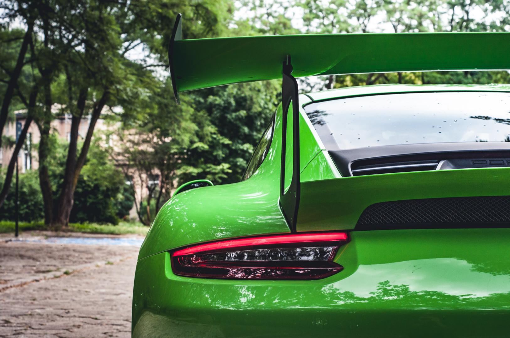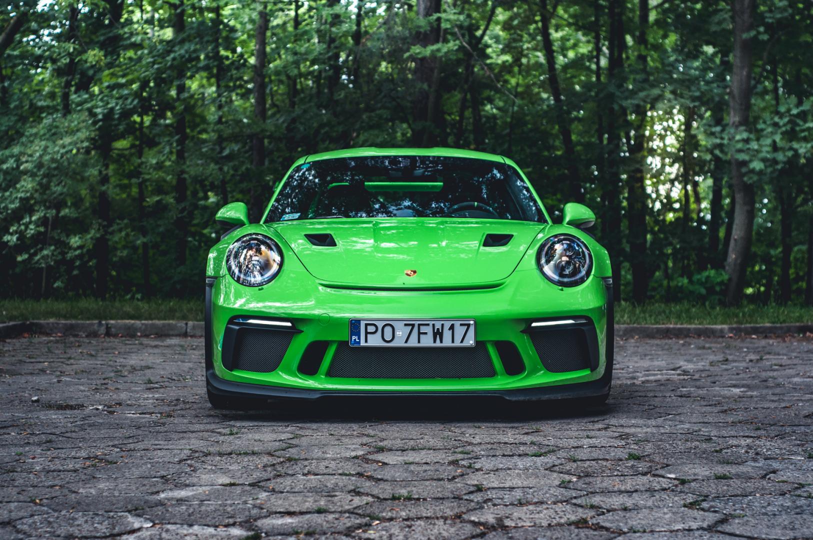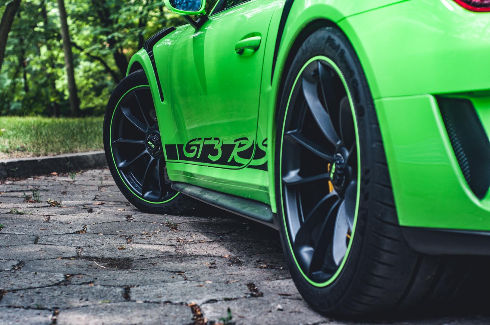 Zacznijmy jednak od wyglądu. GT3 RS ma wielki spoiler z tyłu, przedni splitter, 20-calowe felgi z przodu i 21-calowe z tyłu. Z centralną śrubą oczywiście. Nasz egzemplarz został wykończony kolorem Lizard Green. Kosztował tylko 18 tys. zł.