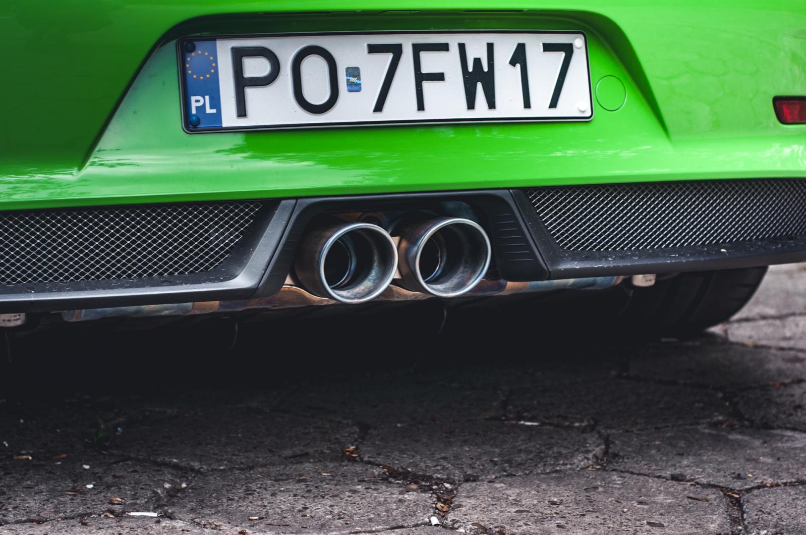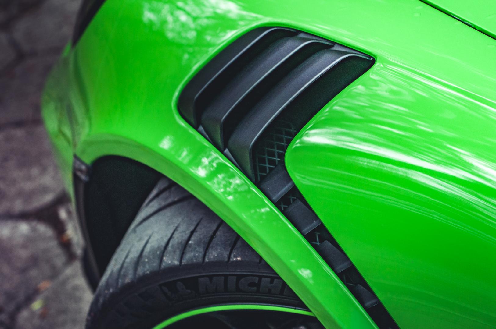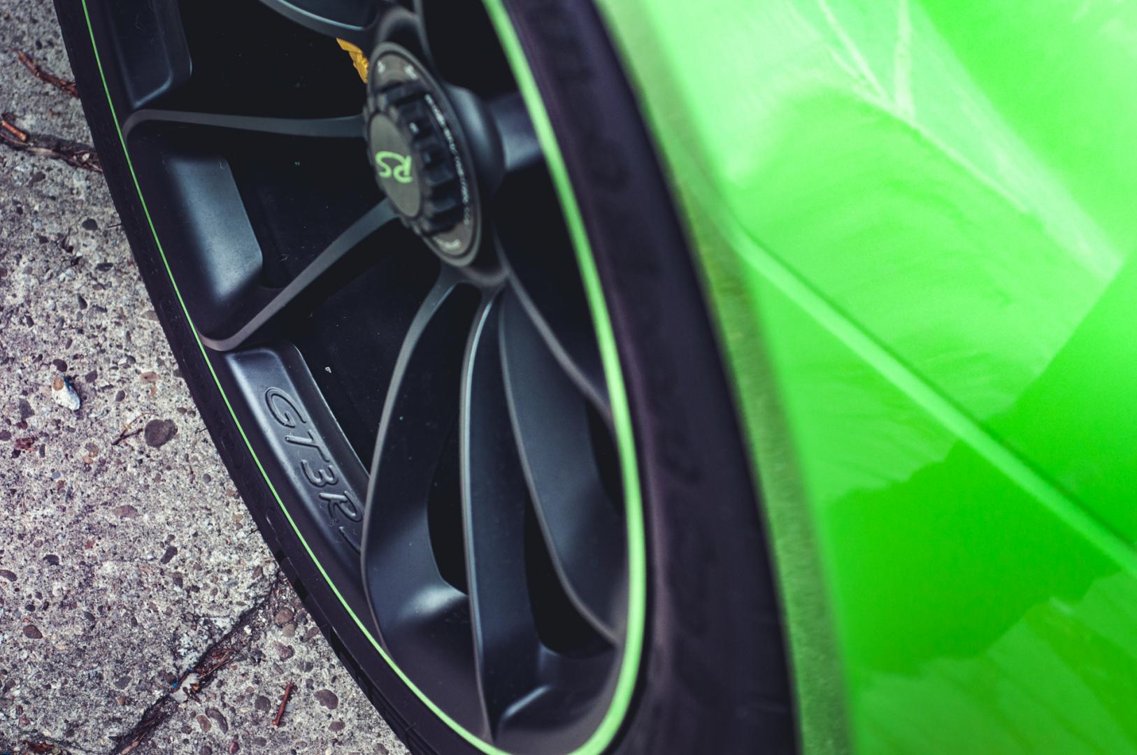 Zacznijmy jednak od wyglądu. GT3 RS ma wielki spoiler z tyłu, przedni splitter, 20-calowe felgi z przodu i 21-calowe z tyłu. Z centralną śrubą oczywiście. Nasz egzemplarz został wykończony kolorem Lizard Green. Kosztował tylko 18 tys. zł.