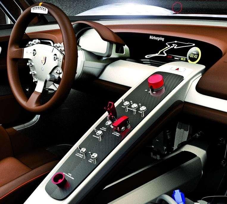 Wnętrze samochodu jest znacznie bardziej techniczne niż w przypadku 918 Spyder. Centralna konsola ma postać pasa z prostymi przełącznikami. Po jego prawej stronie jest opisany wyżej akumulator, a po lewej fotel kierowcy. Jest on kubełkowy, mocno dopasowany i umieszczono kryty brązową skórą, którą obito także deskę rozdzielczą, drzwi i obszyto kierownicę. Między tablicą rozdzielczą a centralną konsolą jest duży wyświetlacz, na którym umieszczony jest plam toru Nurburgring. Kierowca może obserwować swoją pozycję na torze i miejsca rywali. Hybrydowa technologia na tym torze zdążyła już debiutować pod maską Porsche 911 GT3 R, podobnie jak na torach Zhuai w Chinach i amerykańskim torze Road w Atlancie, gdzie samochód brał udział w wyścigach American Le Mans Series.