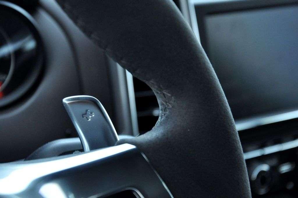Po kilku rundach „zwykłą” Cayenne S przesiadam się do Cayenne GTS. Nie przeżywam przy tym jakiegoś szczególnego szoku, ale znaczki GTS widoczne w paru miejscach i kierownica obszyta alcantarą nie pozwalają się pomylić – wsiadłem do właściwego wozu. Po uruchomieniu silnika dostrzegam jednak pierwszą większą różnicę. Koniec z grzecznym, spokojnym warkotem – tu cztery rury wydechowe strzelają groźnie już w oczekiwaniu na ruszenie z miejsca.