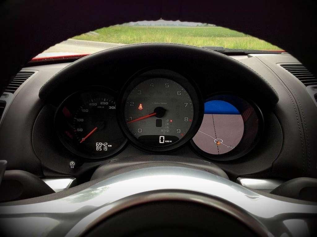 Stacyjka standardowo po lewej stronie, przekręcam kluczyk, chwilę czekam i… a jednak. Cayman też potrafi wywołać dreszcze. Chwilę po rozruchu silnik wydaje taki dźwięk, jakby zaraz miał się rozsypać, ale jego warkot szybko zmienił się w dużo bardziej wymowne brzmienie. Czym Cayman S różni się od zwykłej wersji? Przede wszystkim właśnie motorem. 3.4l pojemności, „sucha miska olejowa”, zmienny skok zaworów VarioCam Plus, zmienne fazy rozrządu i bezpośredni wtrysk paliwa… Co to daje? Czystą moc 325KM przy 7400 obr./min. – bez żadnych turbosprężarek i podobnych wynalazków. Z kolei moment obrotowy 370Nm jest dostępny w przedziale 4500-5800 obr./min. Silnik nie ma wiele pracy, ponieważ auto w około 44% zostało wykonane z aluminium. Nie mogłem się oprzeć przed sprawdzeniem całości na drodze.