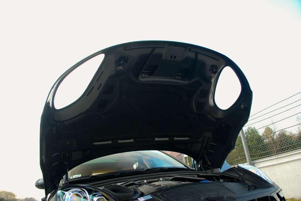 Przyjrzyjmy się Porsche Macan na zewnątrz – jego wymiary stawiają go w jednym rzędzie z innymi kompaktowymi crossoverami (dł. 4681 mm, szer. 1923 mm, wys. 1624 mm). Na pierwszy rzut oka wydaje się, że jest on miniaturą modelu Cayenne. Jednak kiedy postawimy obok siebie te dwa auta, natychmiast zauważymy, że projektanci nie poszli na łatwiznę i postanowili stworzyć coś zupełnie nowego. Pierwszą rzeczą, na którą prawdopodobnie zwrócimy uwagę, będzie szeroka maska, która otacza reflektory oraz nadkola, sięgając górnej linii zderzaka. Muszę przyznać, że wygląda to dość dziwacznie – szczególnie mały element blachy, będący namiastką przedniego błotnika. Szeroka maska ma wizualnie podkreślić masywność nadwozia Porsche Macan. Jednak ten skomplikowany kształt powoduje też, że jej zamknięcie może stanowić problem - komunikat o jej niedomknięciu widzieliśmy dwukrotnie podczas testu.