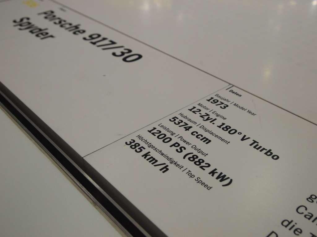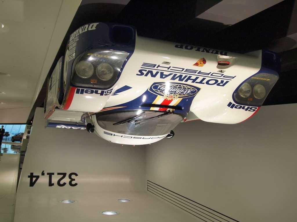 Jeden z samochodów został przytwierdzony do sufitu oraz opisany liczbą 321,4. Dlaczego? Z obliczeń inżynierów Porsche wynika, że przy takiej prędkości spojlery wyścigowego bolidu wygenerowałyby siłę docisku aerodynamicznego, która przewyższyłaby masę pojazdu, teoretycznie pozwalając na jazdę do góry kołami. Teoretycznie, ponieważ na taki wyczyn nie pozwoliłaby konstrukcja układu smarowania silnika.