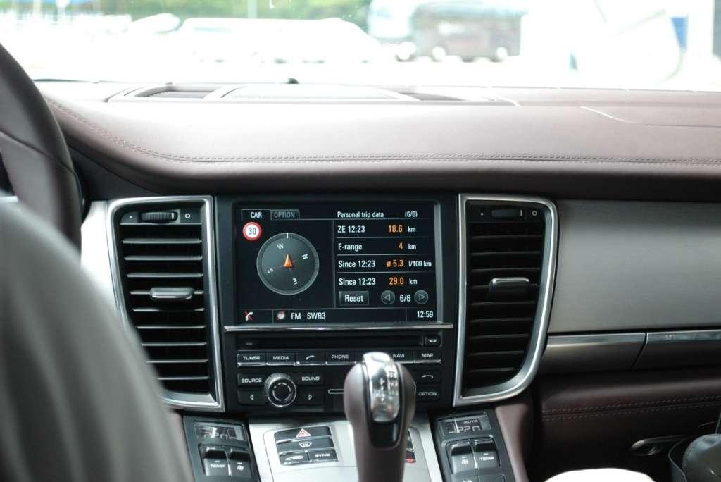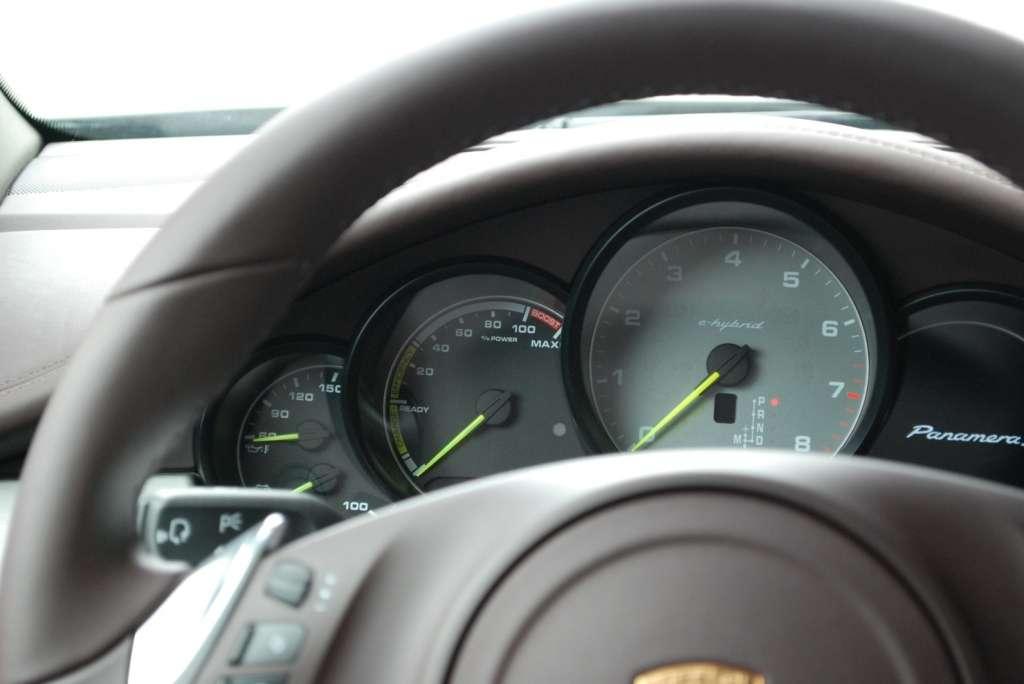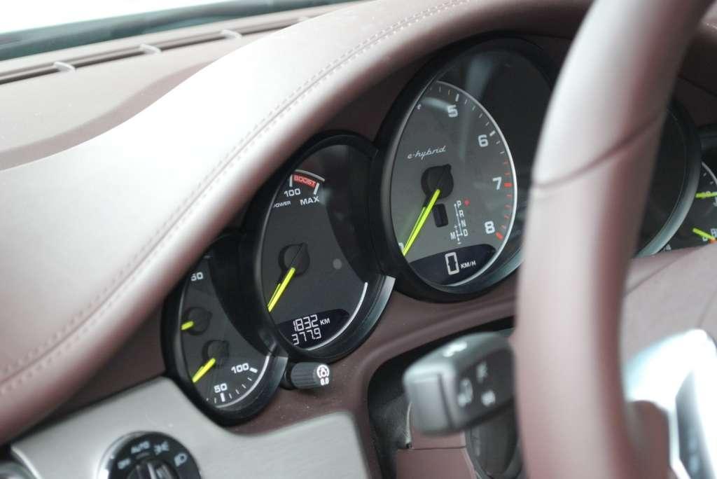 Kiedy zajrzymy do środka hybrydy, to znajdziemy tam prawie niezmienione wnętrze Panamery. Prawie, bo jeśli dokładniej przyjrzymy się zegarom, to zauważymy zielone wskazówki oraz brak analogowego prędkościomierza. Zamiast niego widzimy tzw. Power Meter, czyli miernik mocy. Jego skala rozpoczyna się od pola Ready, które informuje o gotowości do pracy oraz mocy z jaką odbywa się obecnie proces rekuperacji. Dalej znajduje się pole informujące nas w procentach jak bardzo eksploatujemy moc systemową, a powyżej niego jest pole Boost wskazujące chwilowe zwiększenie mocy. Po prawej stronie obrotomierza znajduje się kolorowy wyświetlacz, który przedstawia przepływ energii w systemie oraz wartości statystyczne związane z poszczególnymi trybami jazdy.