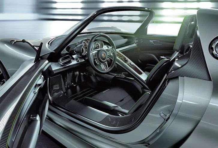 Porsche 918 Spyder ma nadwozie zbudowane z włókien węglowych, magnezu i aluminium, dzięki czemu całość waży tylko 1490 kg.