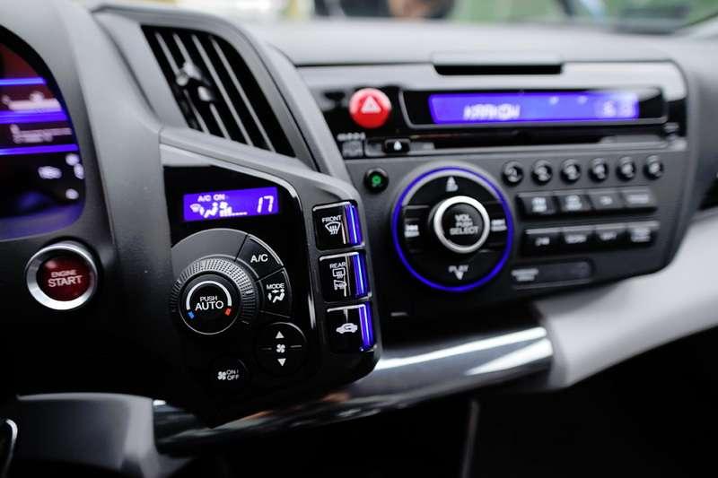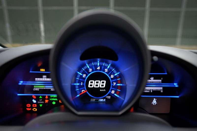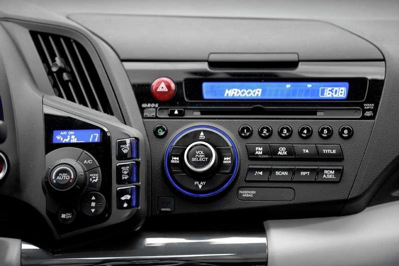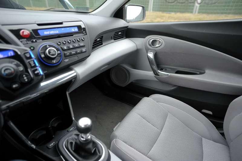 We wnętrzu kompaktowej Hondy jest równie ciekawie i nowocześnie, co zapowiada, że jazda hybrydą faktycznie może nie być taka nudna. Awangardowe rozwiązania z Insighta w CR-Z zostały podniesione do potęgi. Deska rozdzielcza z centralnie umieszczonym obrotomierzem (punkt w kategorii emocje), poza skalą obrotów, jest w całości cyfrowa i udekorowana całą masą wskaźników. Cyfrowe wyświetlacze oczywiście cały czas na bieżąco informują co dzieje się z samochodem: ile baterii pozostało, ile chwilowo spalamy, czy baterie się ładują czy oddaja energię… Podświetlenie obrotomierza zmienia kolor w zależności od tego jak grzecznie zachowujemy się za kierownicą. Za łagodną i spokojną (chciało by się powiedzieć flegmatyczną) jazdę, rozświetlającą deskę na zielono, dostajemy od Hondy cyfrowe kwiatki. Rosną na wyświetlaczu tym szybciej im bardziej pro-ekologicznie się poruszamy. Gdy nie patyczkujemy się z silnikami (tym spalinowym i elektrycznym) kwiatki więdną a deska razi niebieskim światłem.