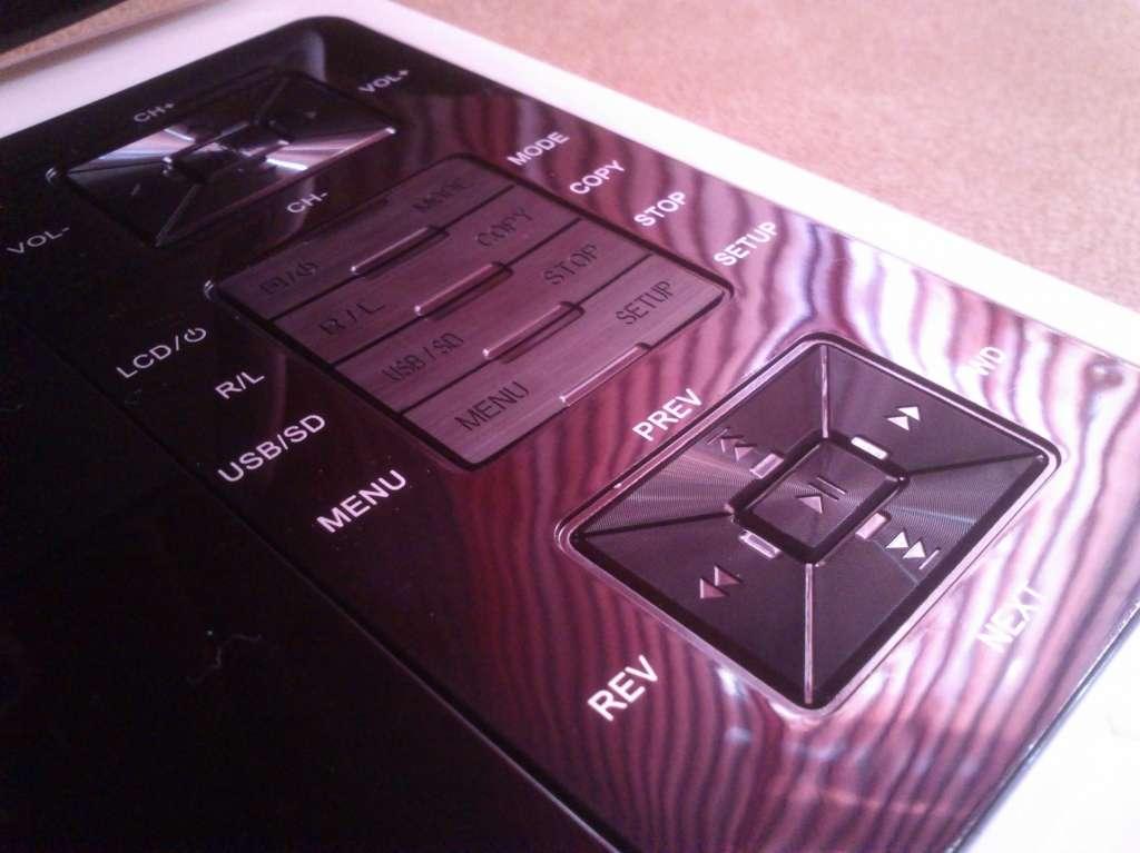 Po wyjęciu wszystkiego z pudełka przejdźmy do oceny jakości użytych materiałów oraz ogólnego wykonania sprzętu. W pierwszej kolejności zajmiemy się oczywiście głównym bohaterem, czyli odtwarzaczem DVD. Po wyjęciu go z pompowanego pokrowca wita nas kolejny ochronny woreczek. Pierwsze wrażenie jest jak najbardziej pozytywne – urządzenie oklejone jest ochronnymi foliami, zarówno na górnej obudowie ekranu, jak i na samym ekranie i panelu sterowania z klapką DVD włącznie. Po zerwaniu folii ochronnych naszym oczom ukazuje się plastikowa obudowa. Na szczęście wszystko jest dobrze spasowane, nic nie trzeszczy, nie wygina się ani nie wydaje dziwnych dźwięków. Większość paneli wykończona jest błyszczącym lakierem, na którym widać każdy ślad. Dzieci z pewnością przyczynią się do wielu rys i zabrudzeń – producent mógł zdecydować się na matowy plastik, na przykład taki, z jakiego zostały wykonane dość gustowne przyciski na urządzeniu. Jeśli chodzi o wspomniane przyciski, działają dość pewnie, choć trochę ciężko i głośno z wyraźnym „klik” przy każdym naciśnięciu.