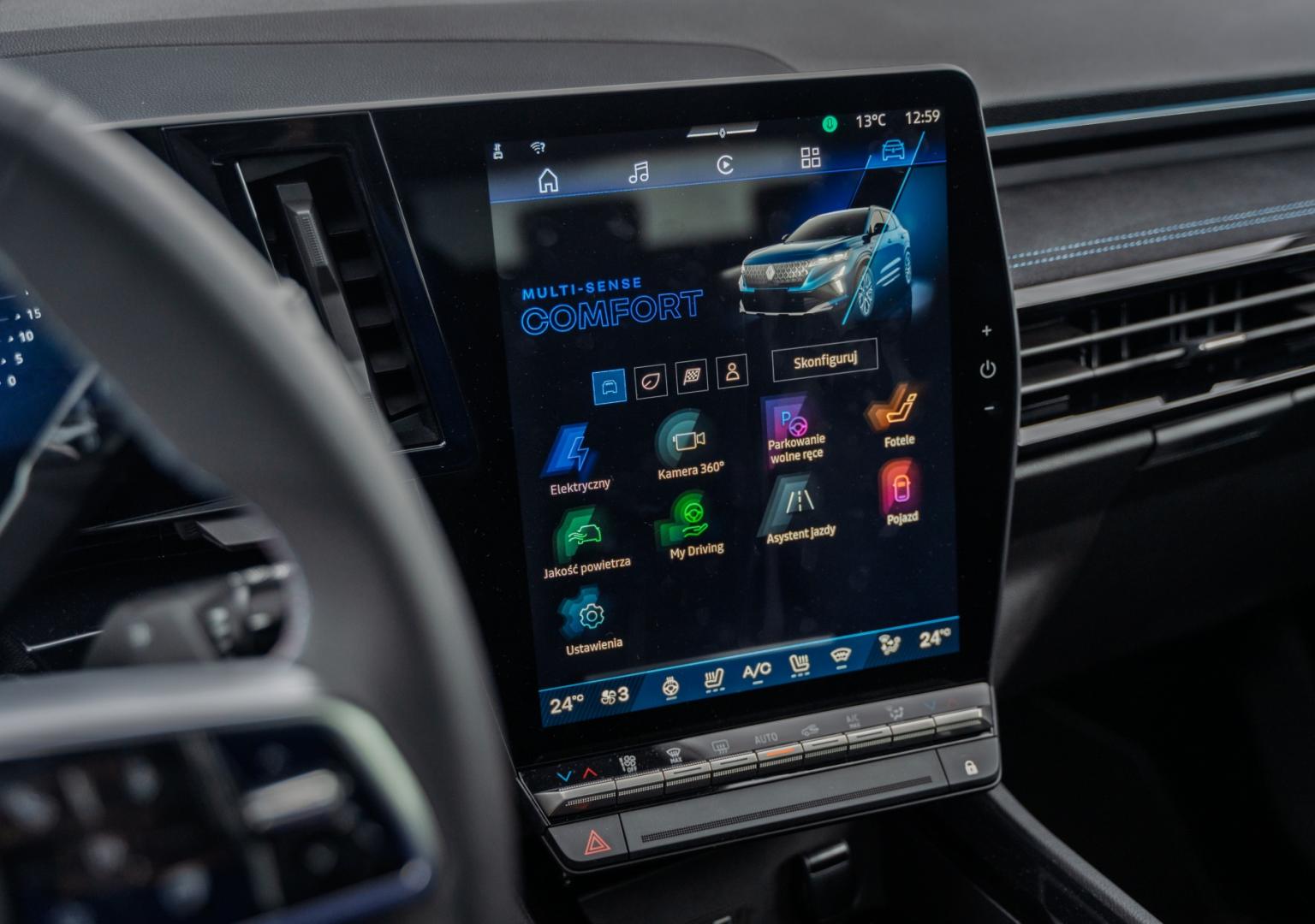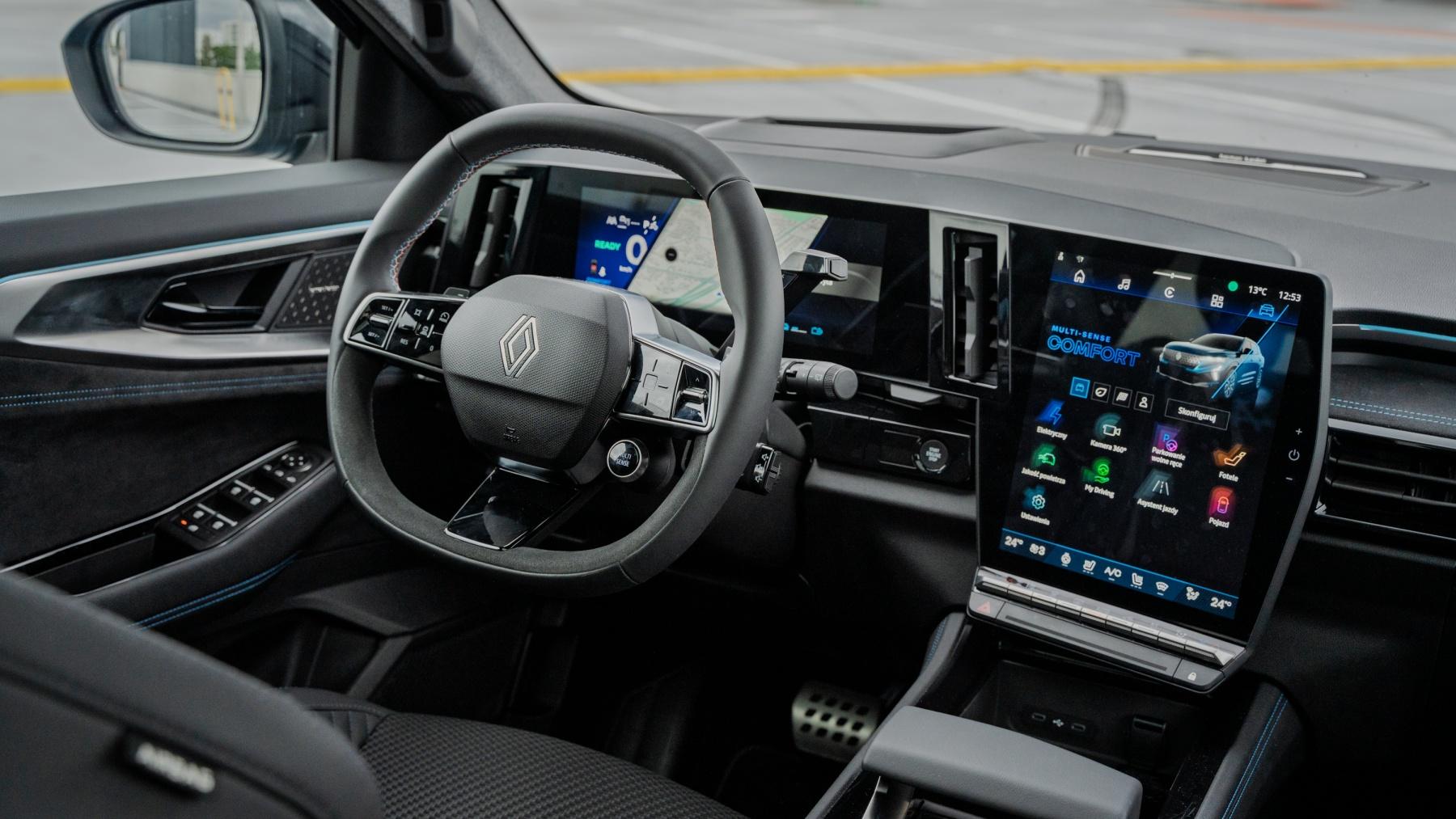 Czas zajrzeć do wnętrza. Tam wita mnie równie elegancka i nowoczesna kabina, jednak nic się w niej nie zmieniło względem przedlifta... Pytanie brzmi co miało by się zmienić? Kokpit składa się z dwóch 12-calowych wyświetlaczy systemu OpenR link opartego na Google Automotive, dzięki czemu użytkownicy smartfonów, zwłaszcza tych z Androidem, od razu się polubią z systemem infotainment Australa. Mamy oczywiście dostęp do usług Google'a, w tym map, sklepu Play czy asystenta głosowego, przy czym trochę zdziwił mnie fakt, że przy okazji liftingu Renault nie zastosowało asystenta głosowego AI rodem z 5 E-Tech. Niemniej reakcja na dotyk jest bardzo dobra, a grafiki przyjemne dla oka. Sam ekran lekko zwrócono w stronę kierowcy, co też ułatwia jego obsługę. Czasami jednak mapy Google'a tracą zasięg i wówczas możemy zapomnieć o nawigacji. Szkoda też, że przy okazji liftingu nie poprawiono płynności działania cyfrowych zegarów, gdyż poszczególne widoki czasem zmieniają się trochę za długo, a mapa przed kierowcą potrafi się zawiesić. Niemniej obsługa Australa jest bardzo wygodna, co zawdzięczamy intuicyjnym przyciskom i przełącznikom na kierownicy oraz fizycznym przełącznikom panelu klimatyzacji.