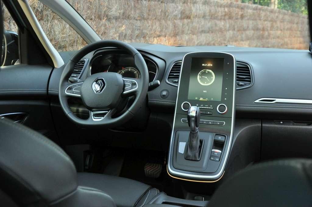 Wnętrze Scenica zaprojektowano w stylu znanym z najnowszych modeli marki, jak Espace, Megane i Talisman. Na środku deski rozdzielczej króluje pionowa konsola z ogromnym także pionowo umieszczonym ekranem dotykowym. W pośrednich wersjach będzie on zorientowany poziomo i znacznie mniejszy, zaś w podstawowej jego miejsce zajmie monochromatyczny wyświetlacz. Wypasione fotele z masażem i wyglądem niczym z lotniczej pierwszej klasy to też domena najbogatszej specyfikacji. Wybór trybów jazdy Multi-Sense obejmujący programy Sport, Comfort, Eco, Neutral i Perso, zmienia styl wyświetlanych wskaźników oraz siłę wspomagania i reakcję na gaz.