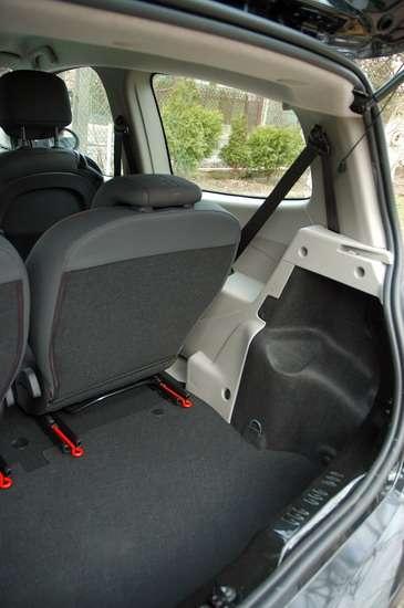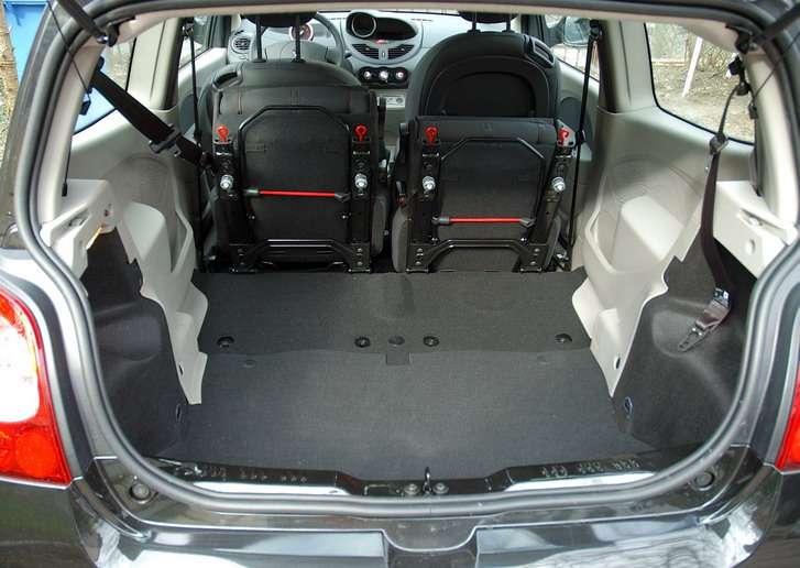 Wnętrze pomieści cztery osoby i przy tych rozmiarach nic w tym dziwnego. Przecież nawet w dużo większych samochodach środkowe miejsce na tylnej kanapie często trzeba traktować jako rozwiązanie awaryjne i nikt nigdy nie chce tam podróżować. W Twingo nikt nawet nie silił się, by myśleć inaczej – i stąd tylko cztery miejsca, za to pasażerowie z tyłu siedzą na niezależnych fotelach (opcja), które można do tego przesuwać i delikatnie pochylać. Tym samym możliwe jest bądź zwiększenie przestrzeni bagażowej, liczącej normalnie 230 litrów, bądź to zapewnienie jako takiego komfortu podróżowania. Pasażerowie z tyłu mają nawet do dyspozycji małe podłokietniki w ściankach – szkoda że twarde, plastikowe, a nie tapicerowane, oraz kieszenie na drobiazgi. Gdy będziemy chcieli przewieźć nieco większy pakunek, fotele można złożyć całkowicie, uzyskując płaską podłogę, jednak z wysoko przebiegającą linią załadunku. Sprytnym rozwiązaniem są za to odpinane dolne zaczepy tylnych pasów, które po zwinięciu nie przeszkadzają wówczas w rozlokowaniu ładunku. Przednie siedzenia są dość proste w kształcie i nieco za mało wyprofilowane, co odczuwa się podczas dynamicznej jazdy. Miejsca na nich jest wystarczająco dużo i nawet wysocy kierowcy nie będą narzekać. Fotel po stronie pasażera, poza tradycyjnym przesuwaniem umożliwiającym zajmowanie miejsca z tyłu (nawet nie wymaga to wielkich zdolności gimnastycznych) można do tego przekształcić w mały stolik – ale to też w ramach opcji dodatkowej.